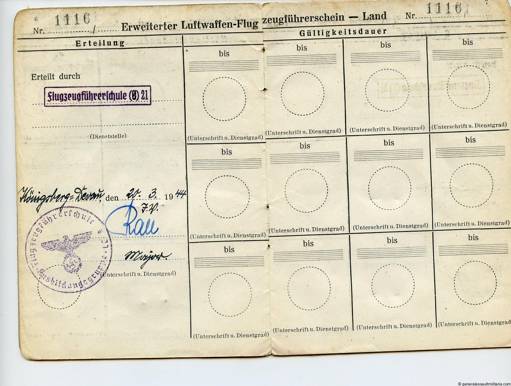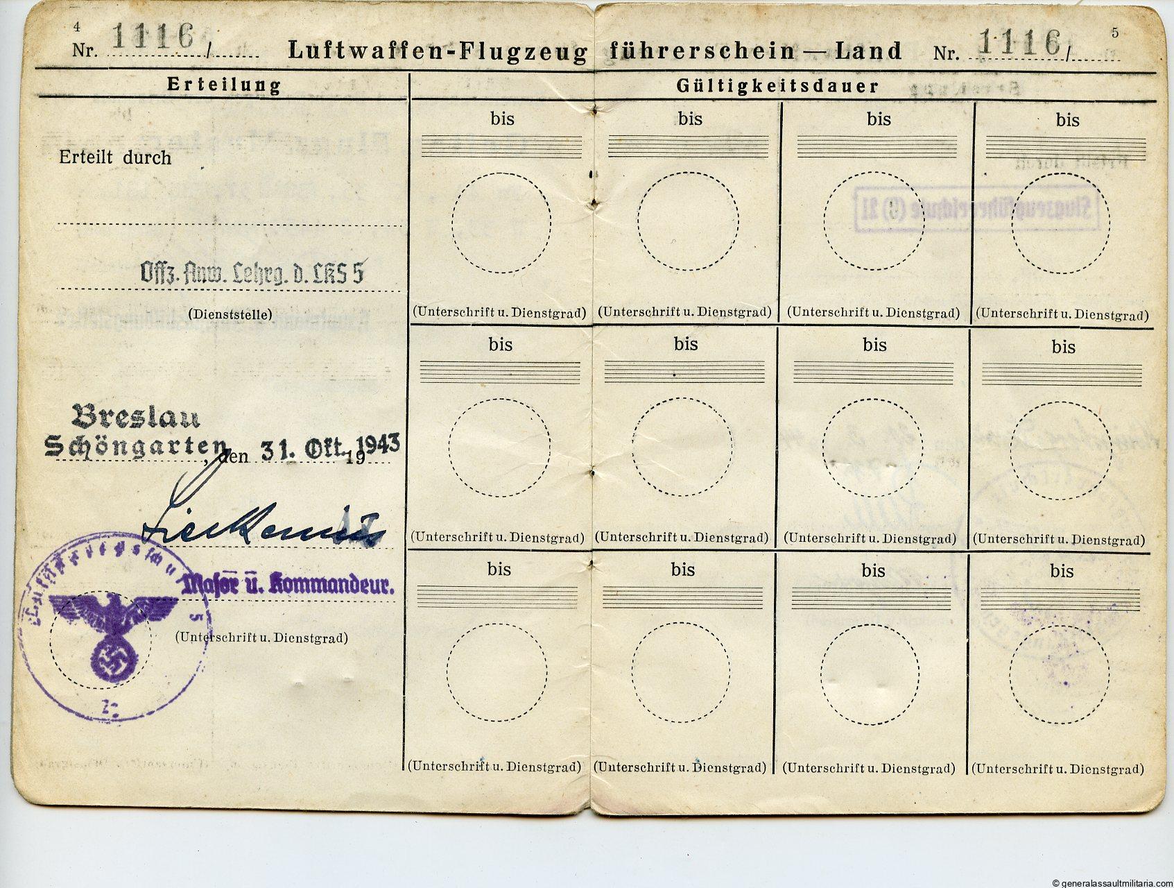 Small Pilot set to Karl Heinz Beck. Contains Beck his pilot badge award document A5 size from 1943 with normal age and wear. His NSFK green ID from when he was a child and his “Flugzeugfhührerschein”(pilot ID). Shows some entries with the planes he flew. Also present is a small leaflet about his release from as POW from the US forces. Interesting little set
