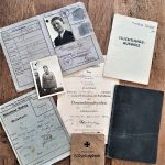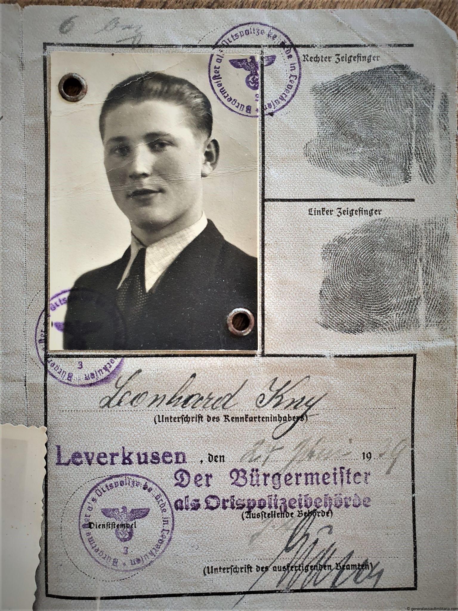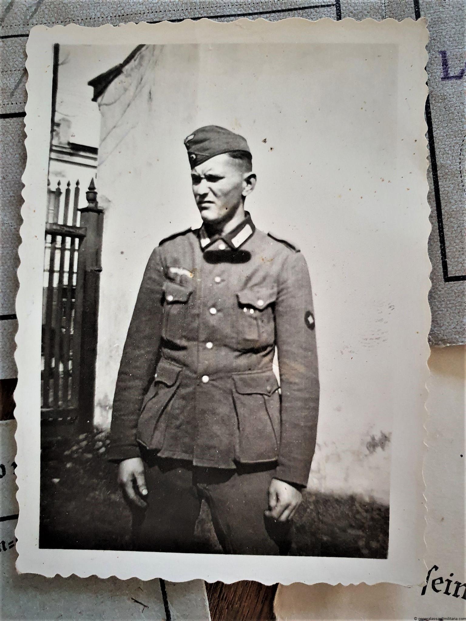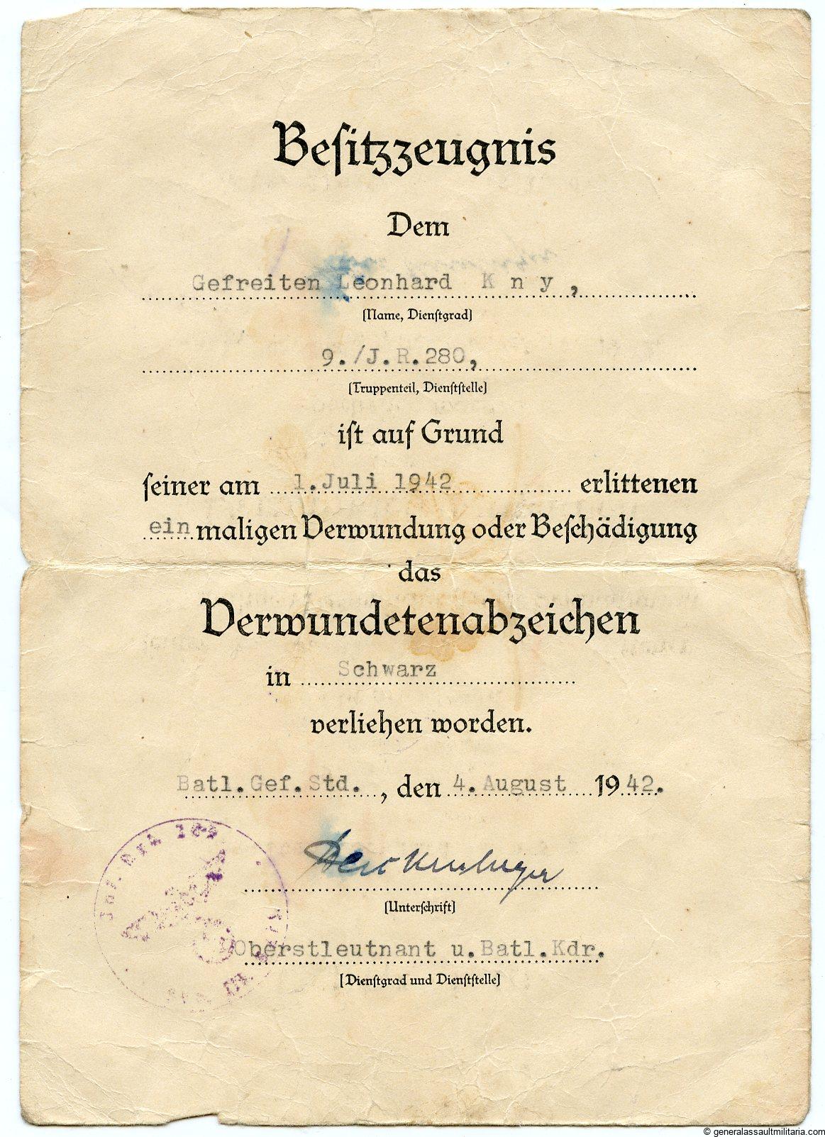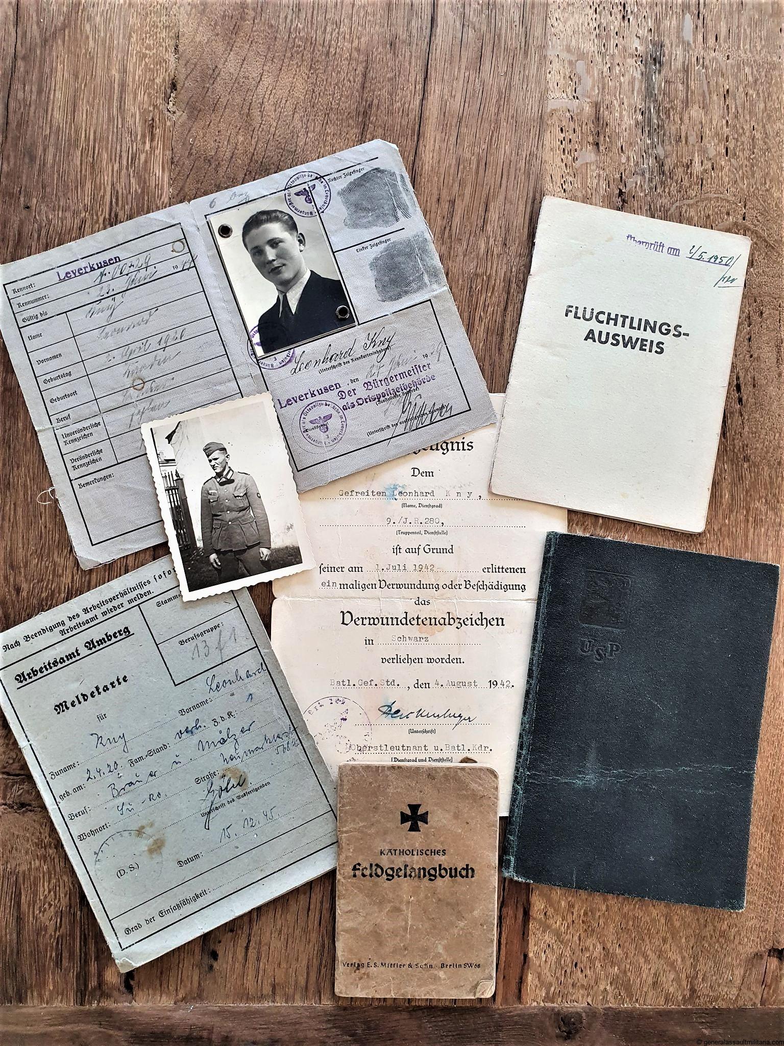 Small estate to Gefreiten Leonhard Kny 9./I.R.280. Cocists out of Kny his wound badge in black document dated 4.aug 1942. His kennkarte(ID), Flüchtlingsausweiss(refugee pass), insurance booklet (USP), Soldiers field bible with some pencil marks inside, picture of Kyn in uniform and a post war work related document.
