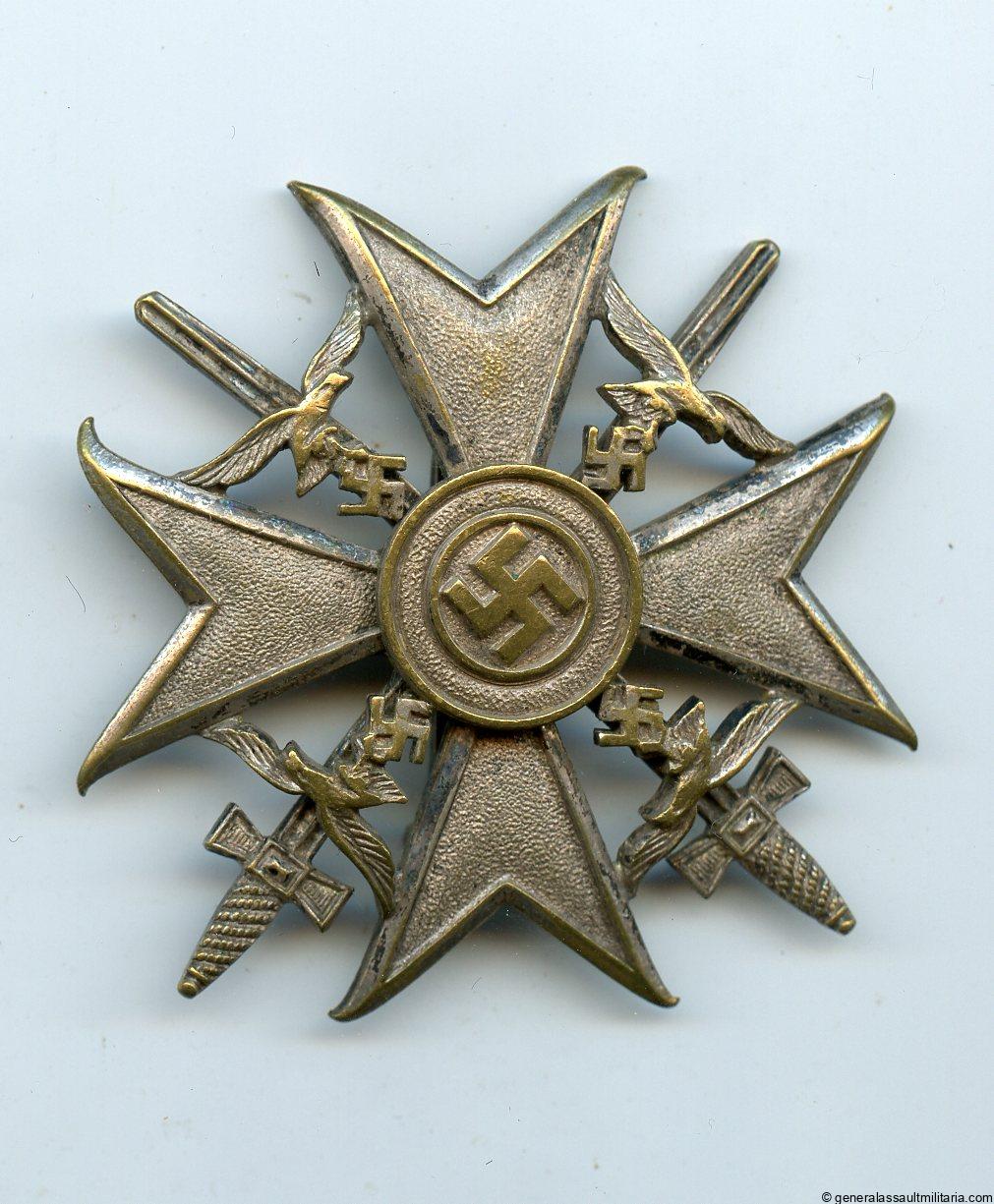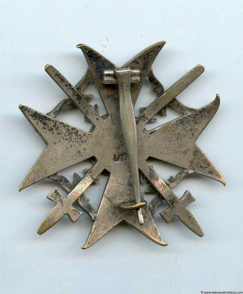 Spanish cross in silver – L/13 Paul Meybauer, Berlin. Early war LDO example with L/13 makers mark for Paul Meybauer and their well known setup. Remains in well worn condition with some of the thick silver plating worn down to the base tombac material. Has some of the corners slightly bent inwards in such a way that it seems it was done on purpose to give the cross a little more flare or slightly dull out the sharp corners. Rarely does a Spanish cross come with so much character, truly field worn Spanienkreuz in Silber.