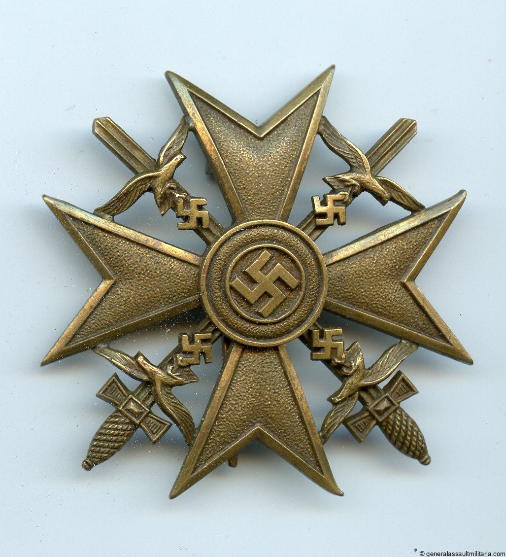Spanish cross with swords in bronze – Paul Meybauer, Berlin. 1939 awarded type with Paul Meybauer design. Tombac construction with bronze finish and soldered on eagles. Remains in excellent lightly worn condition with a great look to it. High quality ‘Spanienkreuz’.
