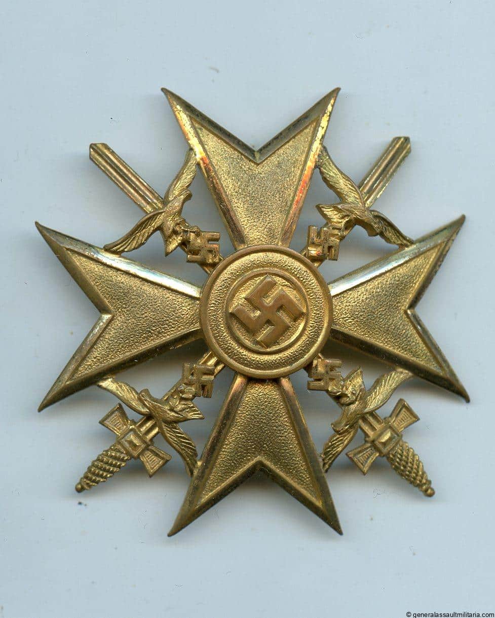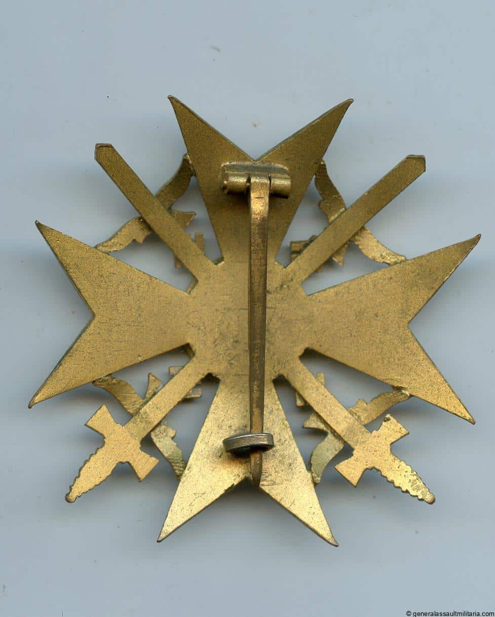 Spanish cross with swords in gold – Wilhelm Deumer, Lüdenscheid. Solid tombac spanish cross with Deumer design and setup. Remains in lightly and very attractive worn condition with nearly all gilding and polished highlights intact. Elegant cross showing Deumer their early war nickel silver catch, soldered eagles and saw like cut sword handles. Very uncommon worn gold example that was only awarded 1126 times. Premium Spanish cross in gold!