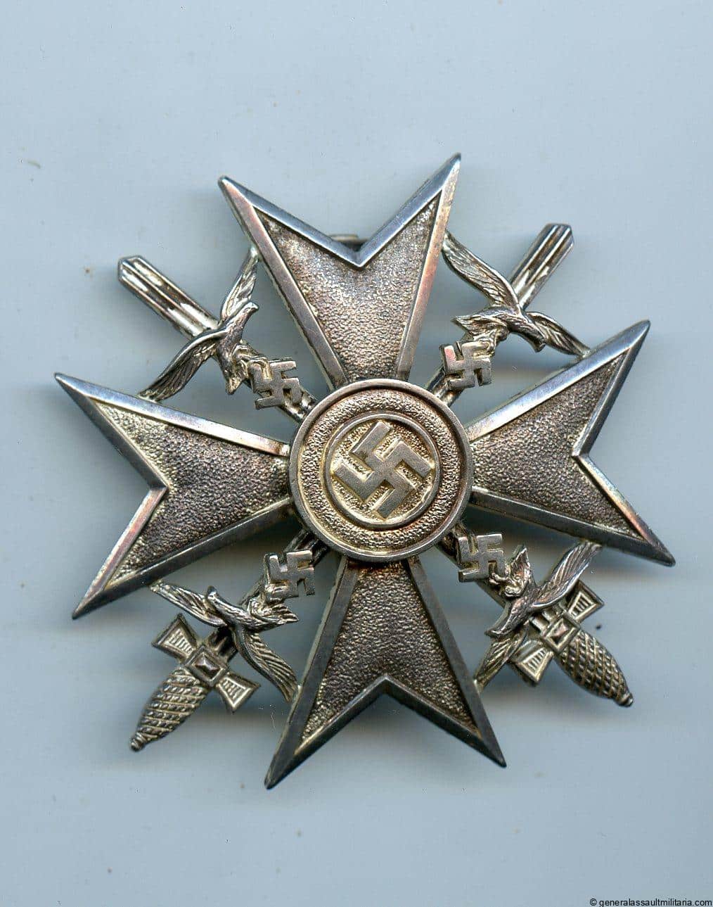 Spanish cross with swords in silver – unknown maker ‘900’. Early awarded type 900 silver ‘Spanienkreuz in Silver’ shows the very sharp and high quality unknown maker design that has been attributed to Godet but remains unconfirmed and is based on the 900 mark found on 1914 Ek1. Cross remains in excellent lightly worn condition with a part of the finish patinated and worn down. One of the best quality and more rare Spanish crosses with all swastika arms cut out.