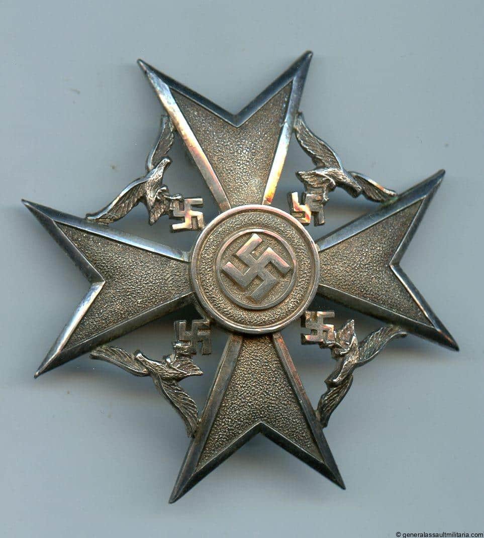 Spanish cross without swords in silver – Paul Meybauer, Berlin. Awarded type 900 silver marked Meybauer design ‘Spanienkreuz’ with soldered eagles. Remains in excellent very lightly worn or unworn condition with factory polished arms and swastika. Beautiful example that only shows a light silver patina. For sure one of the best examples out there and only one of 327 awarded pieces awarded.
