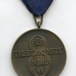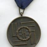 8 years loyal service SS medal – Type 2. Tombac construction type 2 version in very good condition and nearly all bronze finish still present. Shows light usage and has the ribbon in decolored and fairly dirty condition. Quality heavy medal and only one of the few awards only intended for the SS.