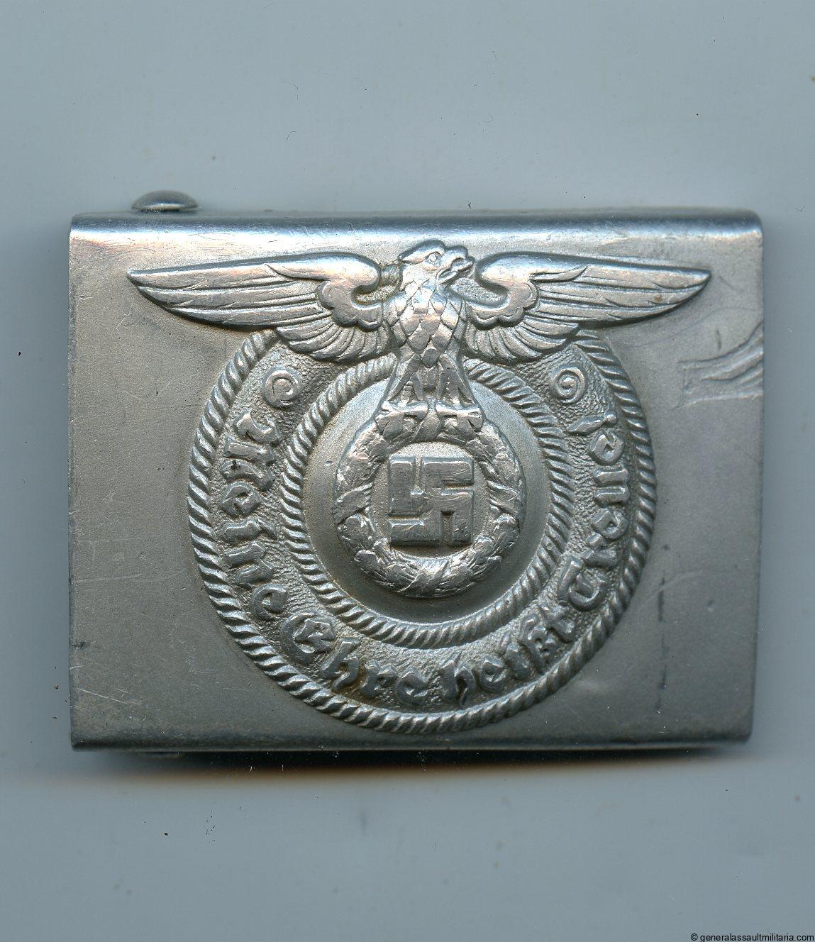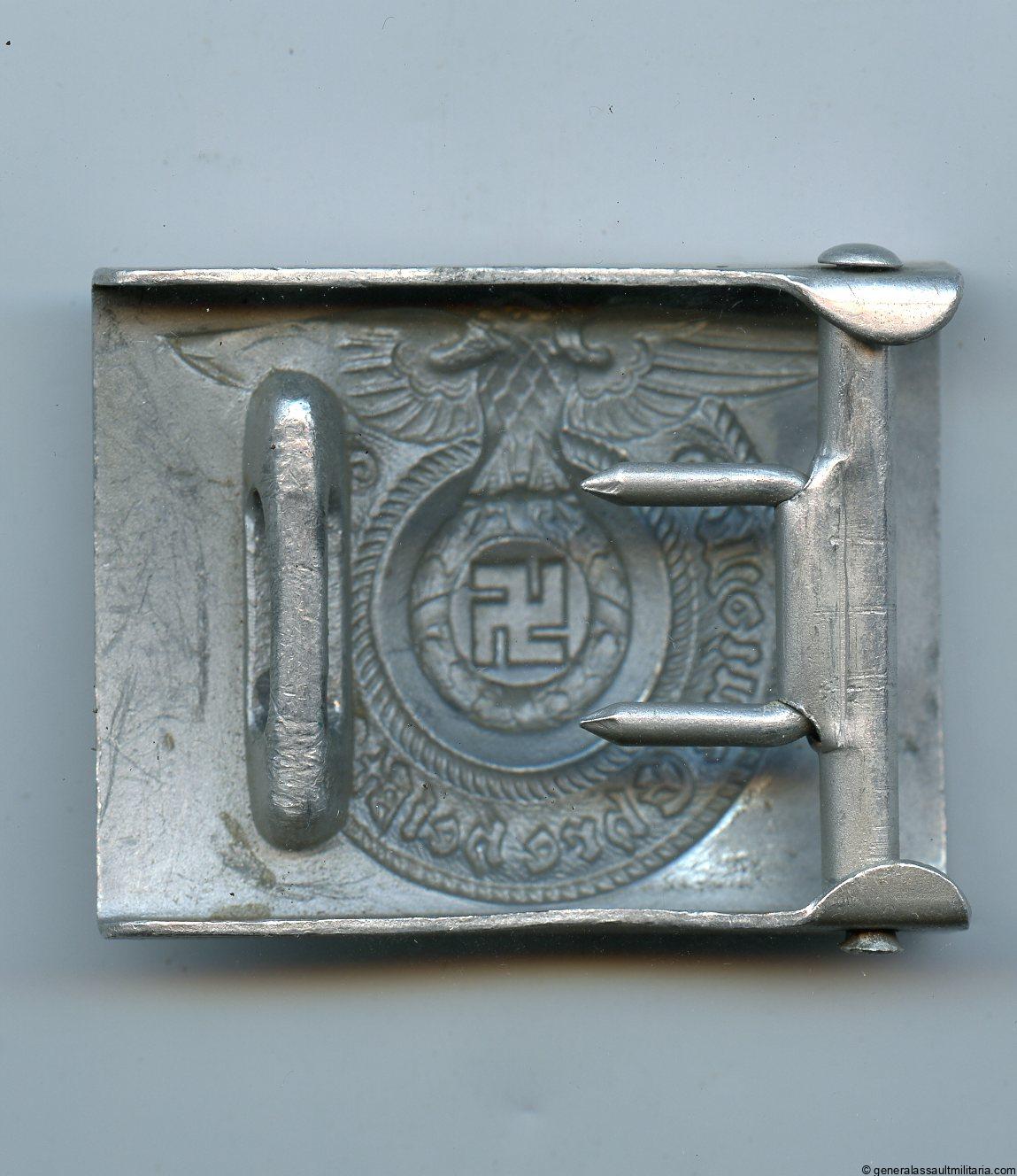 SS buckle – Overhoff & Cie, Lüdenscheid. Early pre war aluminum buckle RZM 36/38 SS, produced in 1938. Remains in good worn condition with wear to the eagle swastika and a mark on the left side, which can also be from production. Good looking and more uncommon pre war produced buckle with a very clear makers mark under the prongs. Very uncommon 38 Overhoff example.