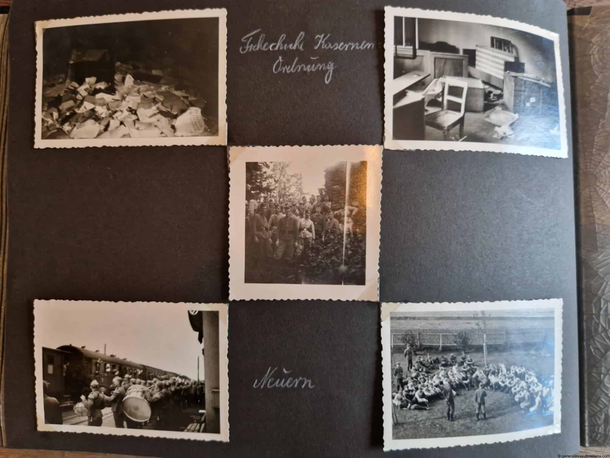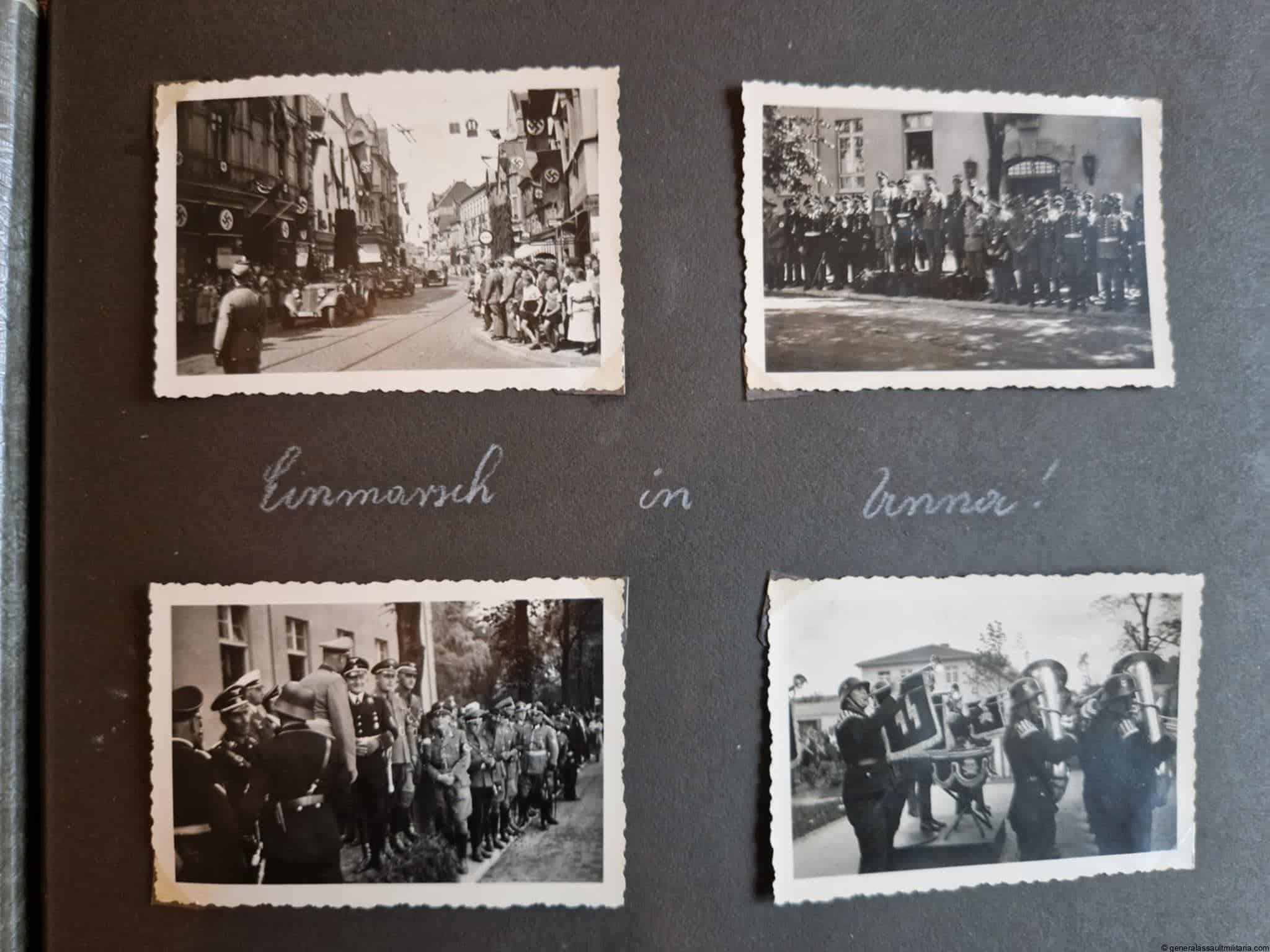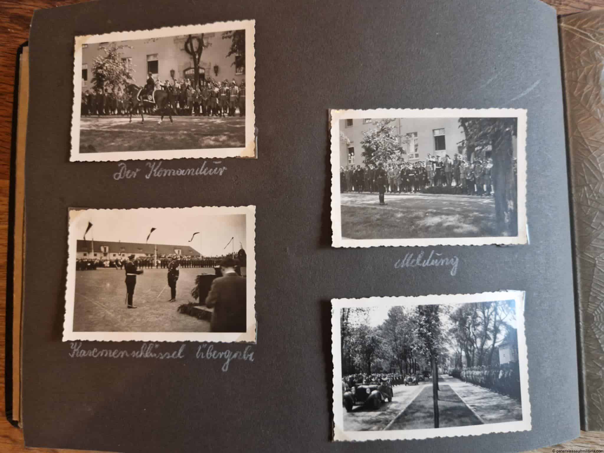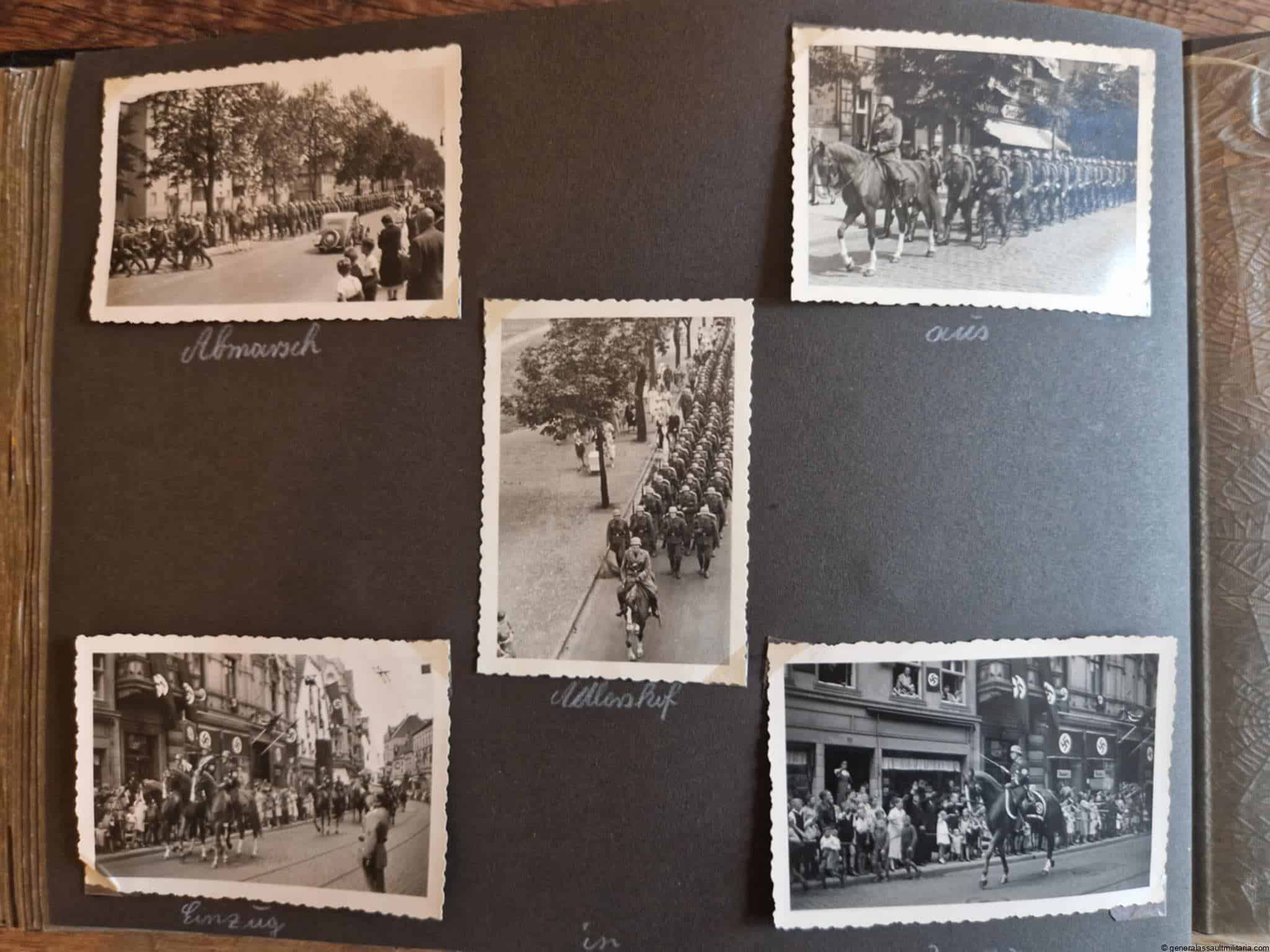 SS-Nachrichtensturmbann Album. Very interesting black SS album with many high quality photos from a member of the SS-Nachrichtensturmbann. Pictures range from 1936 till 1940. Shows many training photos, parades in Austria, Sudetenland(Prag) and Nürnberg. Some very sharp looking Music Corps photos and 2 portraits. A few pictures are missing here and there, about 5-6 in total. Total count is 179 pictures present.