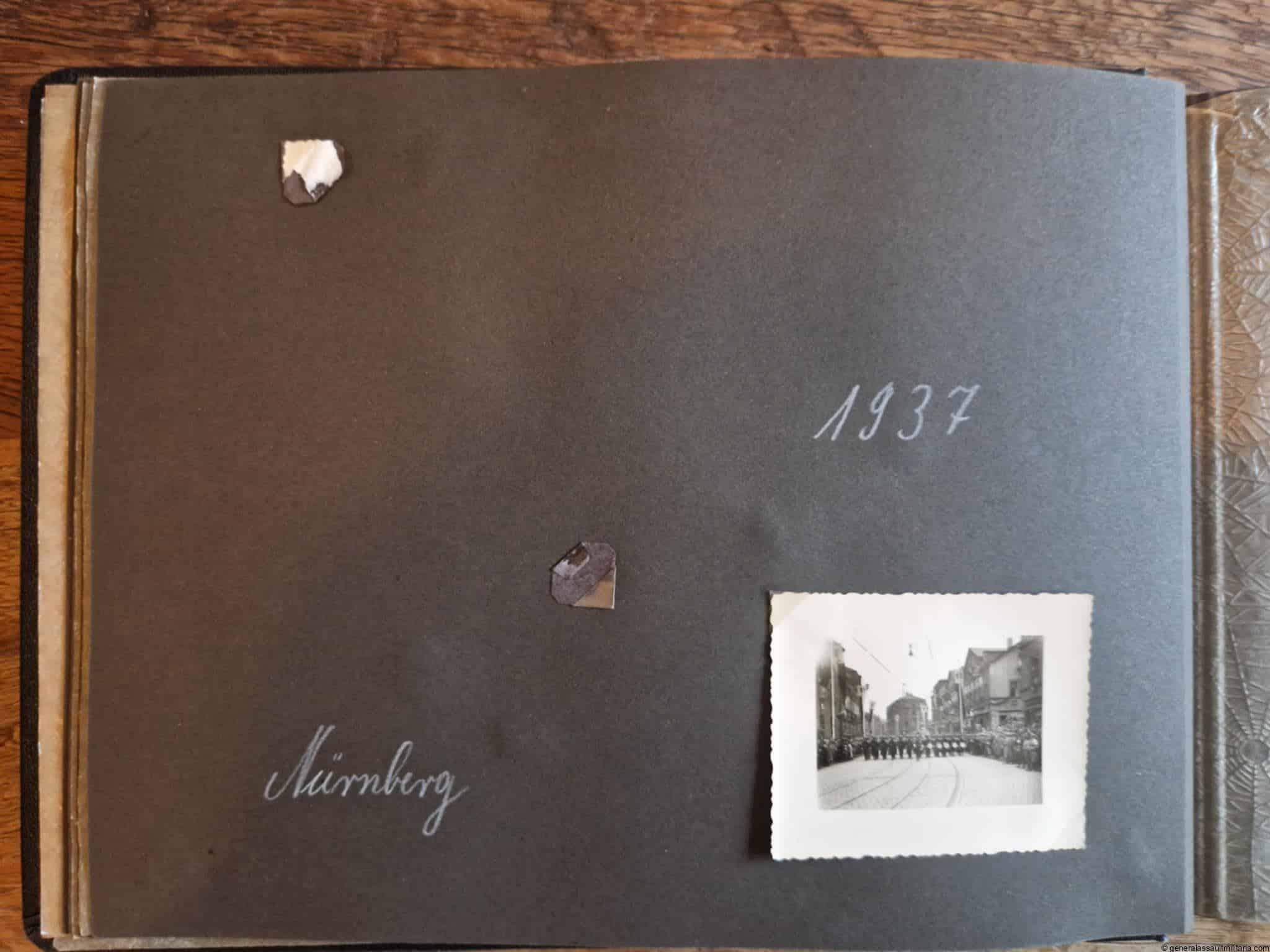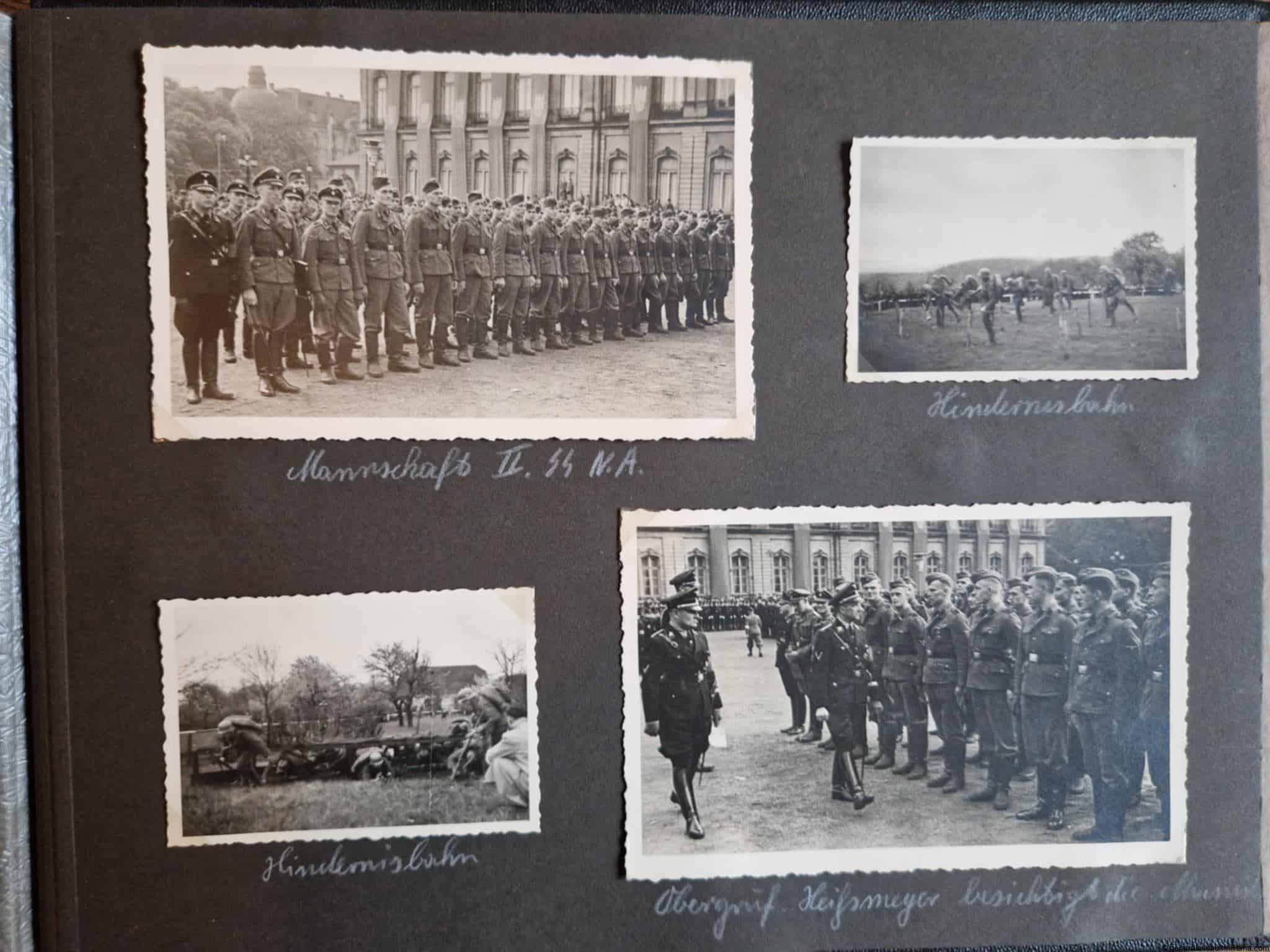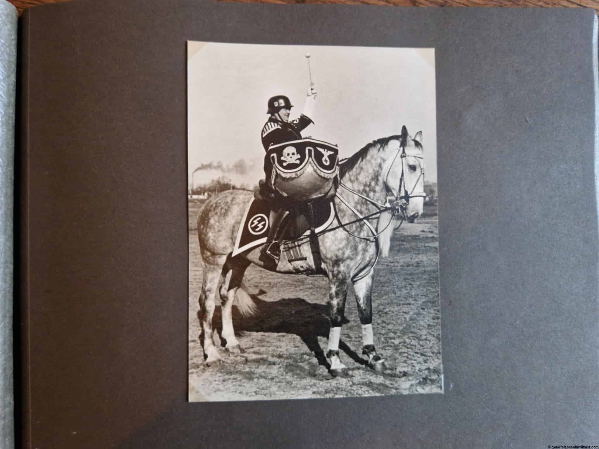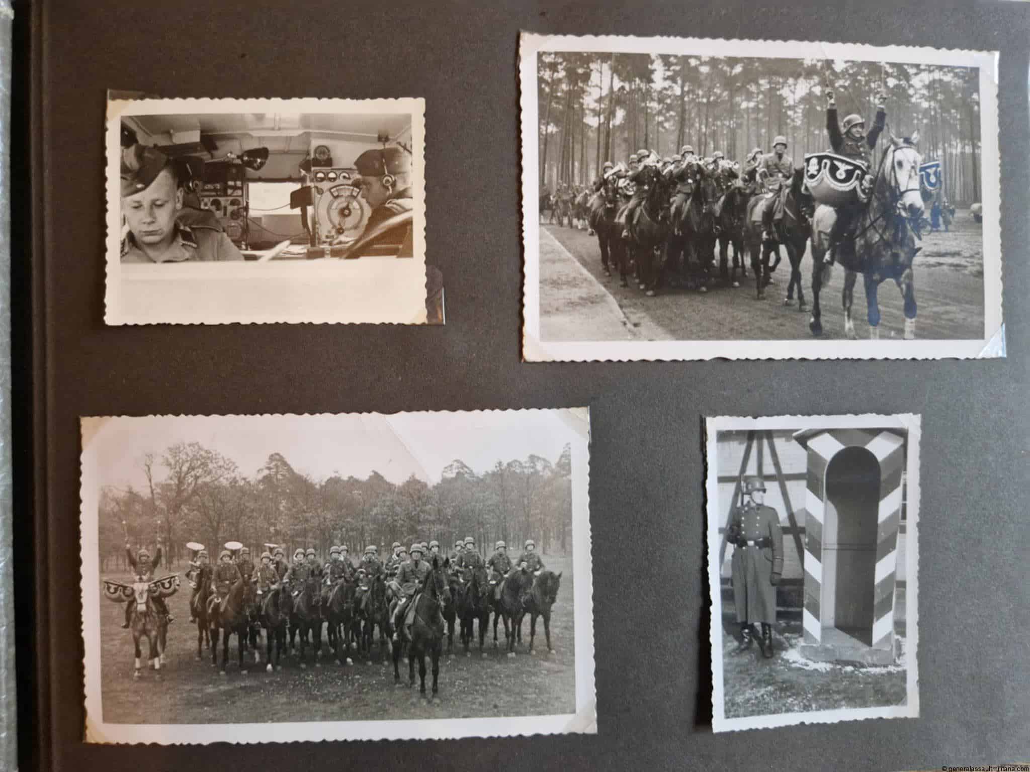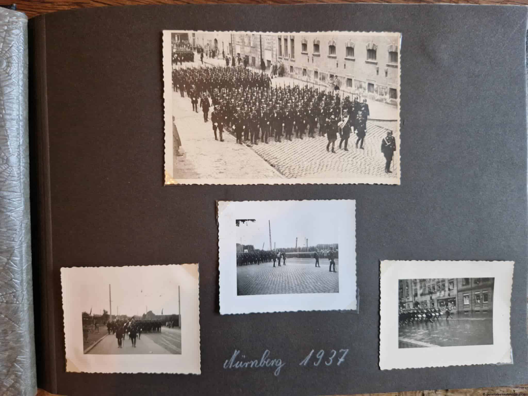 SS-Nachrichtensturmbann Album. Very interesting black SS album with many high quality photos from a member of the SS-Nachrichtensturmbann. Pictures range from 1936 till 1940. Shows many training photos, parades in Austria, Sudetenland(Prag) and Nürnberg. Some very sharp looking Music Corps photos and 2 portraits. A few pictures are missing here and there, about 5-6 in total. Total count is 179 pictures present.