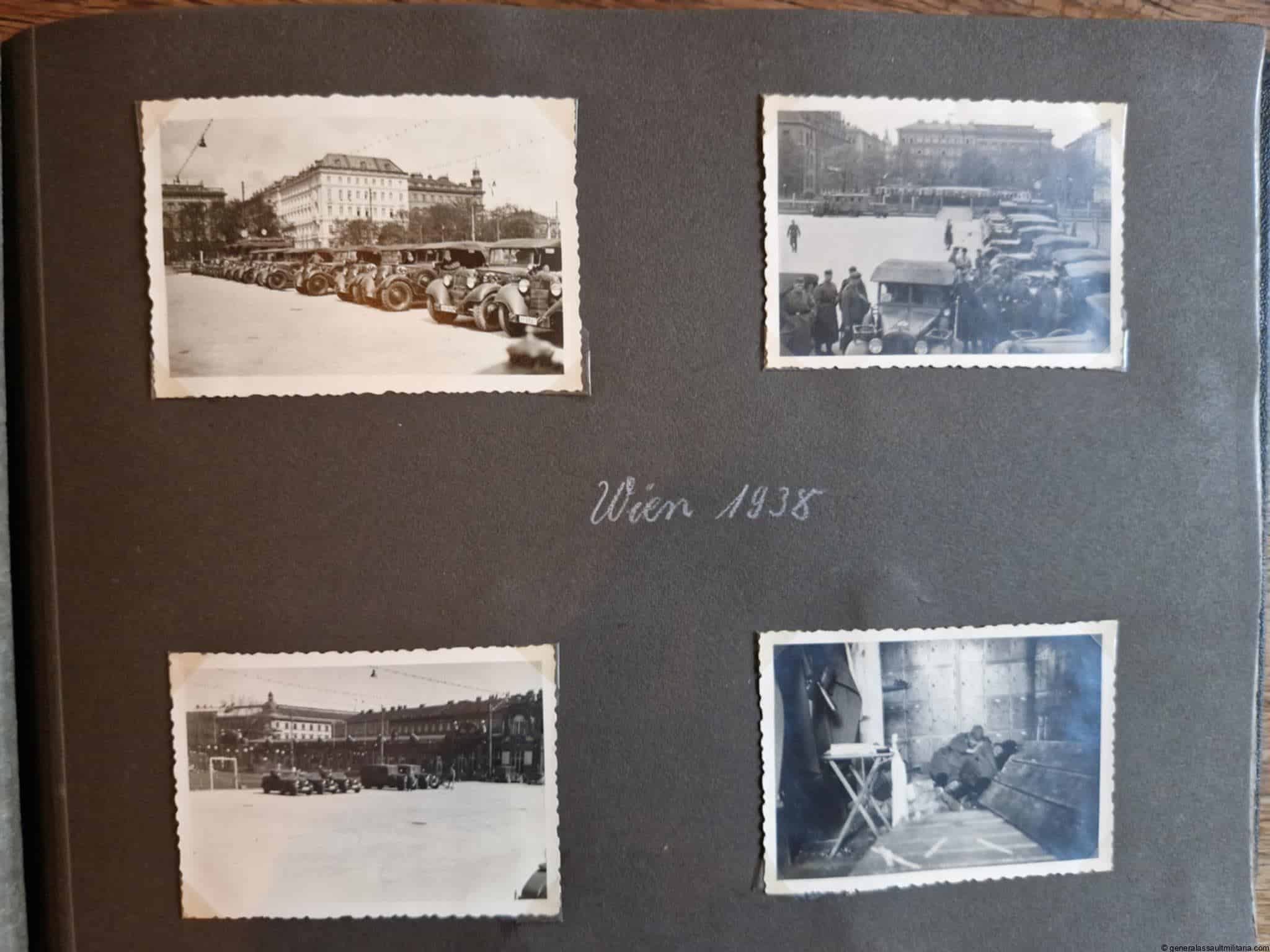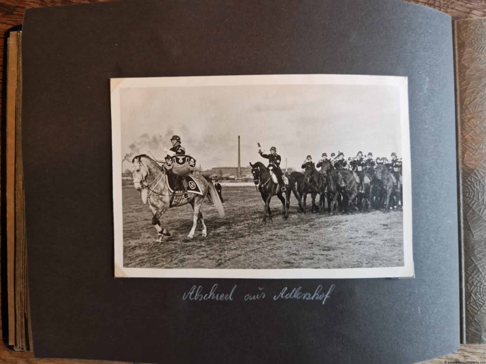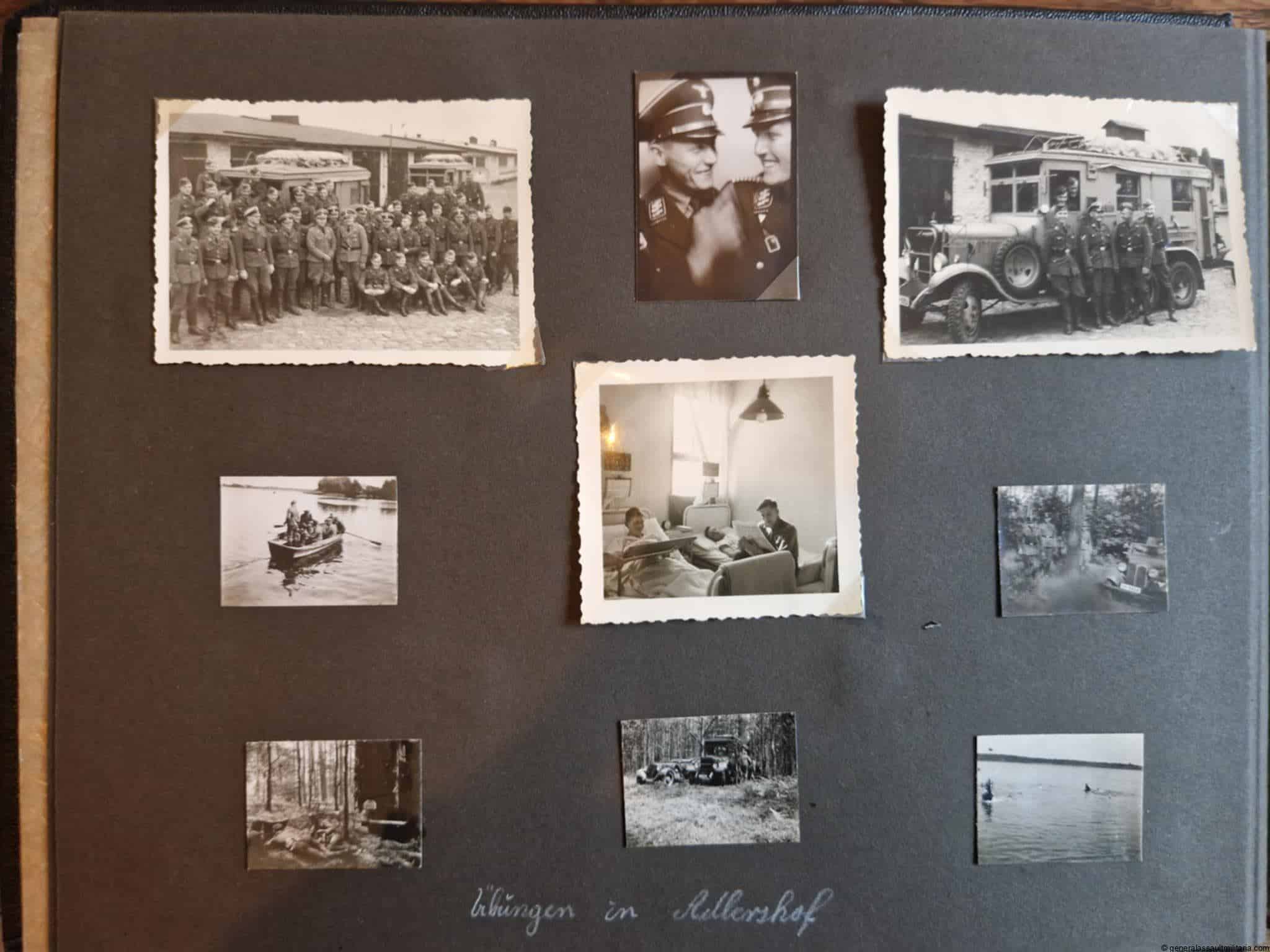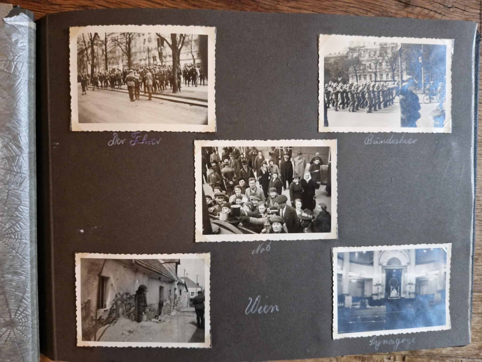 SS-Nachrichtensturmbann Album. Very interesting black SS album with many high quality photos from a member of the SS-Nachrichtensturmbann. Pictures range from 1936 till 1940. Shows many training photos, parades in Austria, Sudetenland(Prag) and Nürnberg. Some very sharp looking Music Corps photos and 2 portraits. A few pictures are missing here and there, about 5-6 in total. Total count is 179 pictures present.
