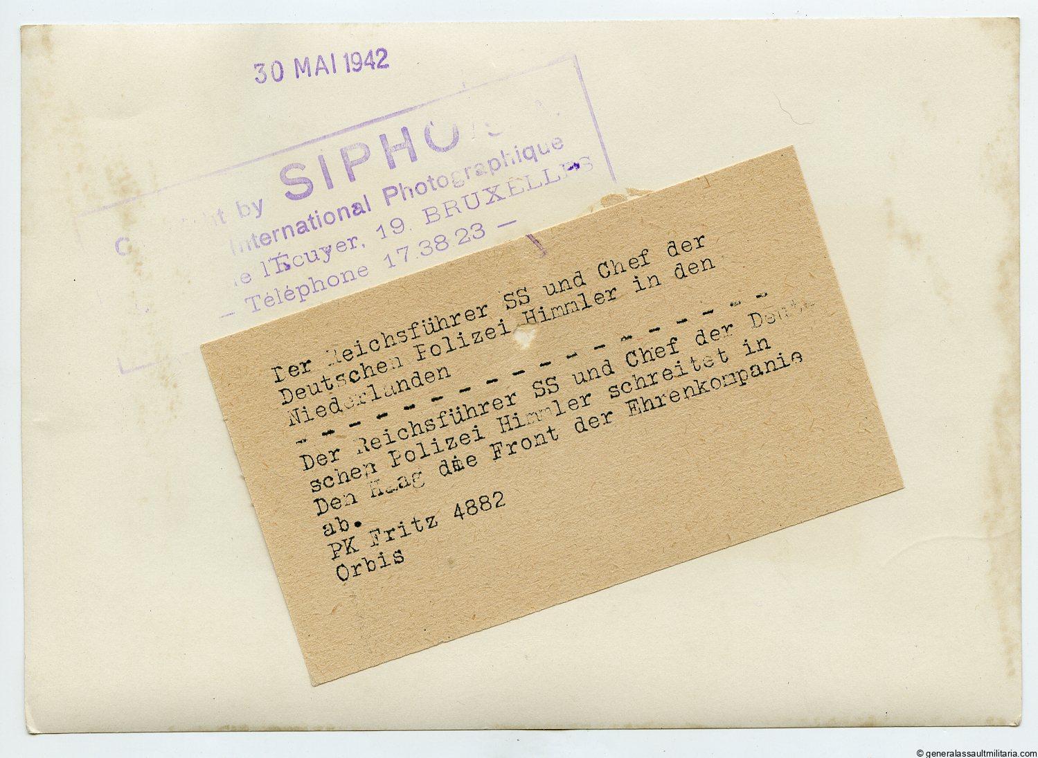 SS press photo – Der Reichsführer-SS in den Niederlanden. Very good condition, dated 30.05.1942. The paper with text on the reverse is lose and can be re glued easily if wished so, I will leave this up to the buyer.