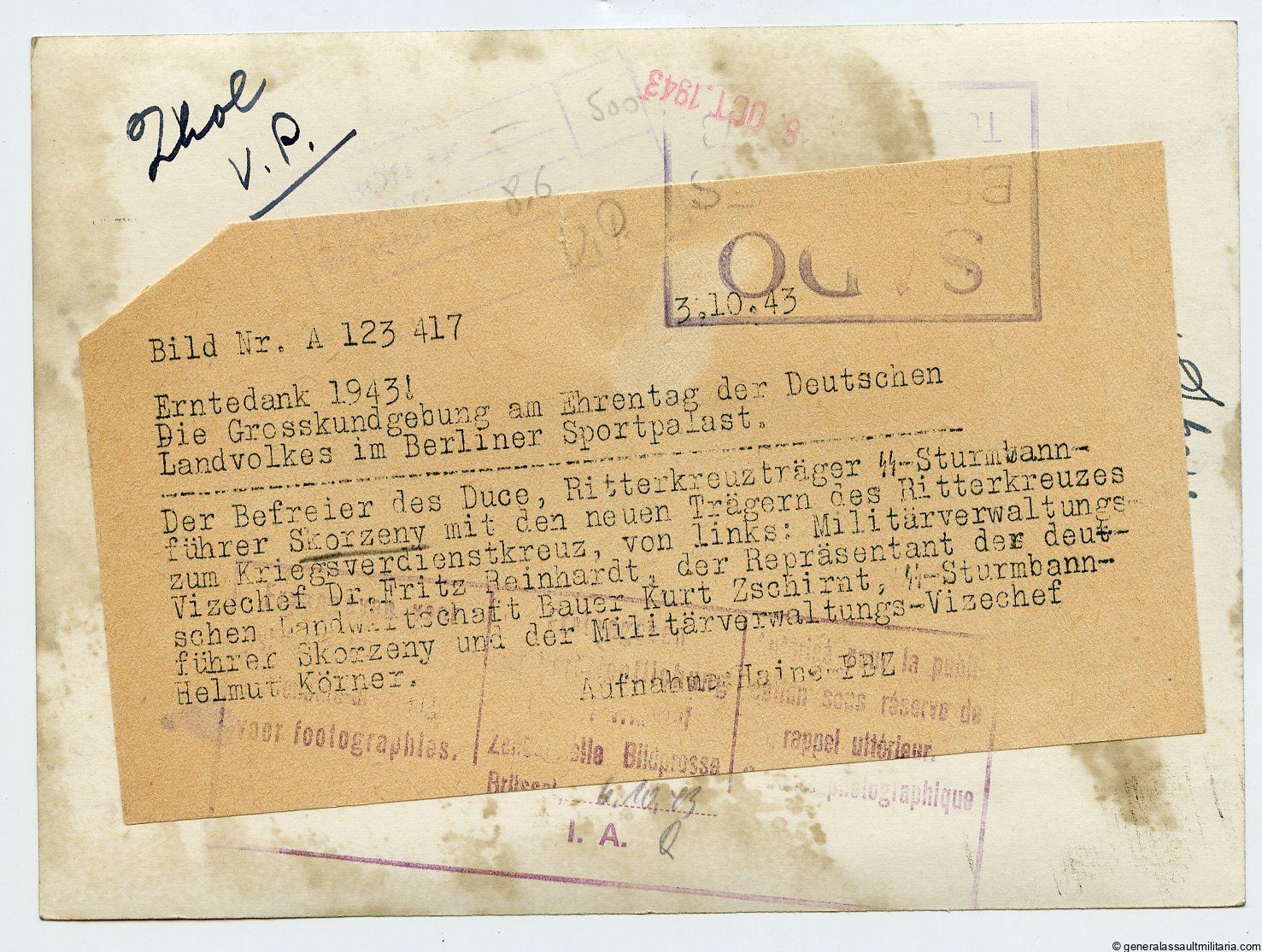 SS press photo – Erntedank 1943 Berliner Sportpalast Skorzeny + KVK RK holders
