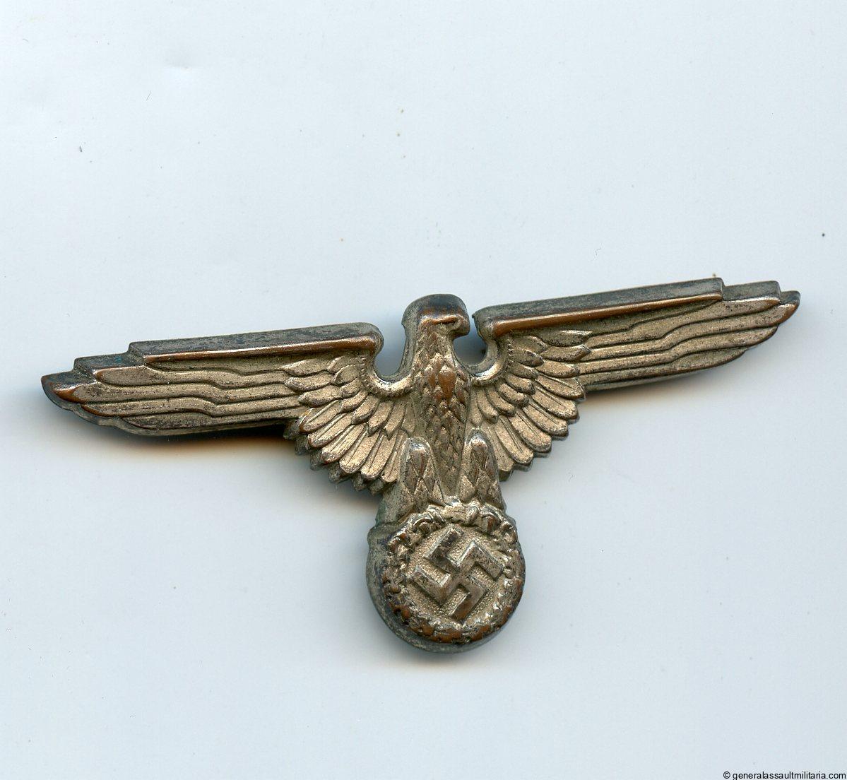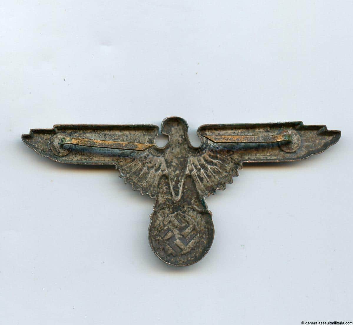 SS visor cap eagle – M1/72 Zimmermann. 1930s produced cupal construction M1/72 (Fritz Zimmermann Pforzheim) marked eagle with soldered on prongs. Remains in lightly worn condition with some of the silver plated finish worn down and a slight patina showing. Has the prongs with base plate still nicely intact. Uncommon eagle.