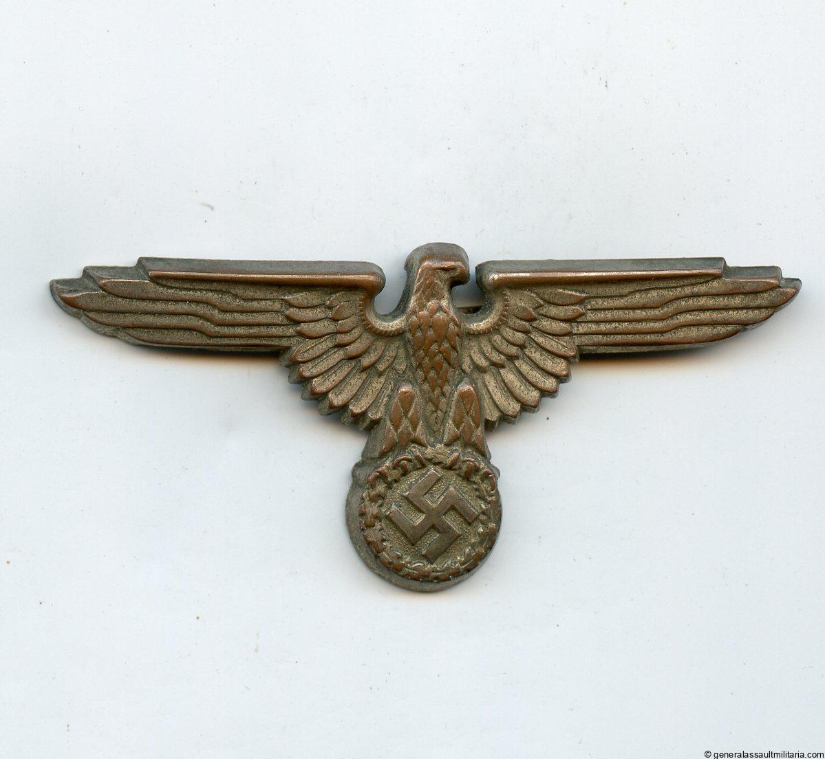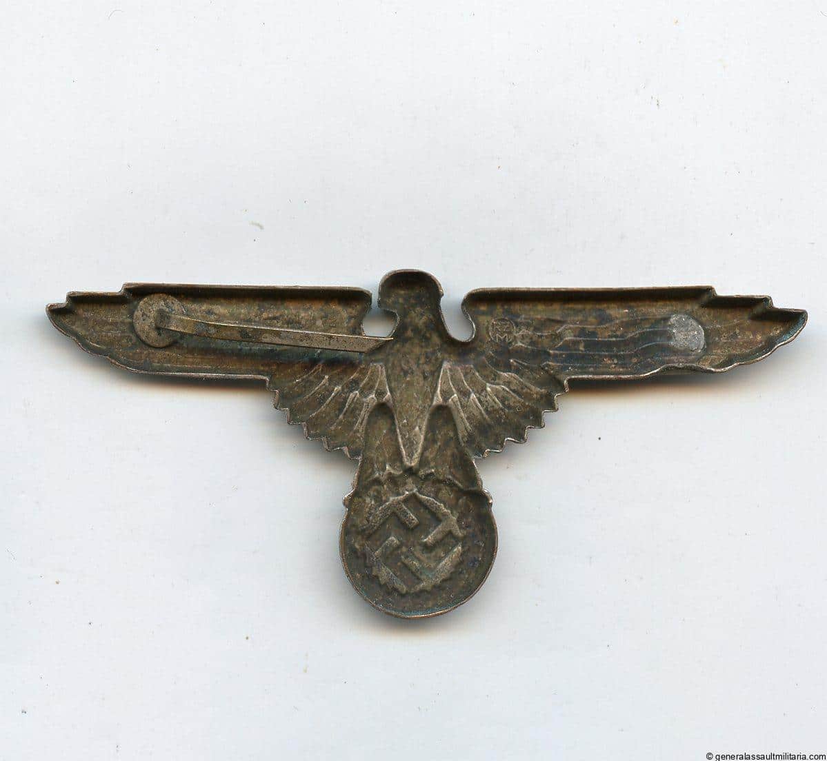 SS visor cap eagle – M1/72 Zimmermann. 1930s produced cupal construction M1/72 (Fritz Zimmermann Pforzheim) marked eagle with soldered on prongs. Remains in well worn condition with some of the silver plated finish worn down and a good patina showing. Has the prongs with base plate and one of them is missing. Uncommon eagle.