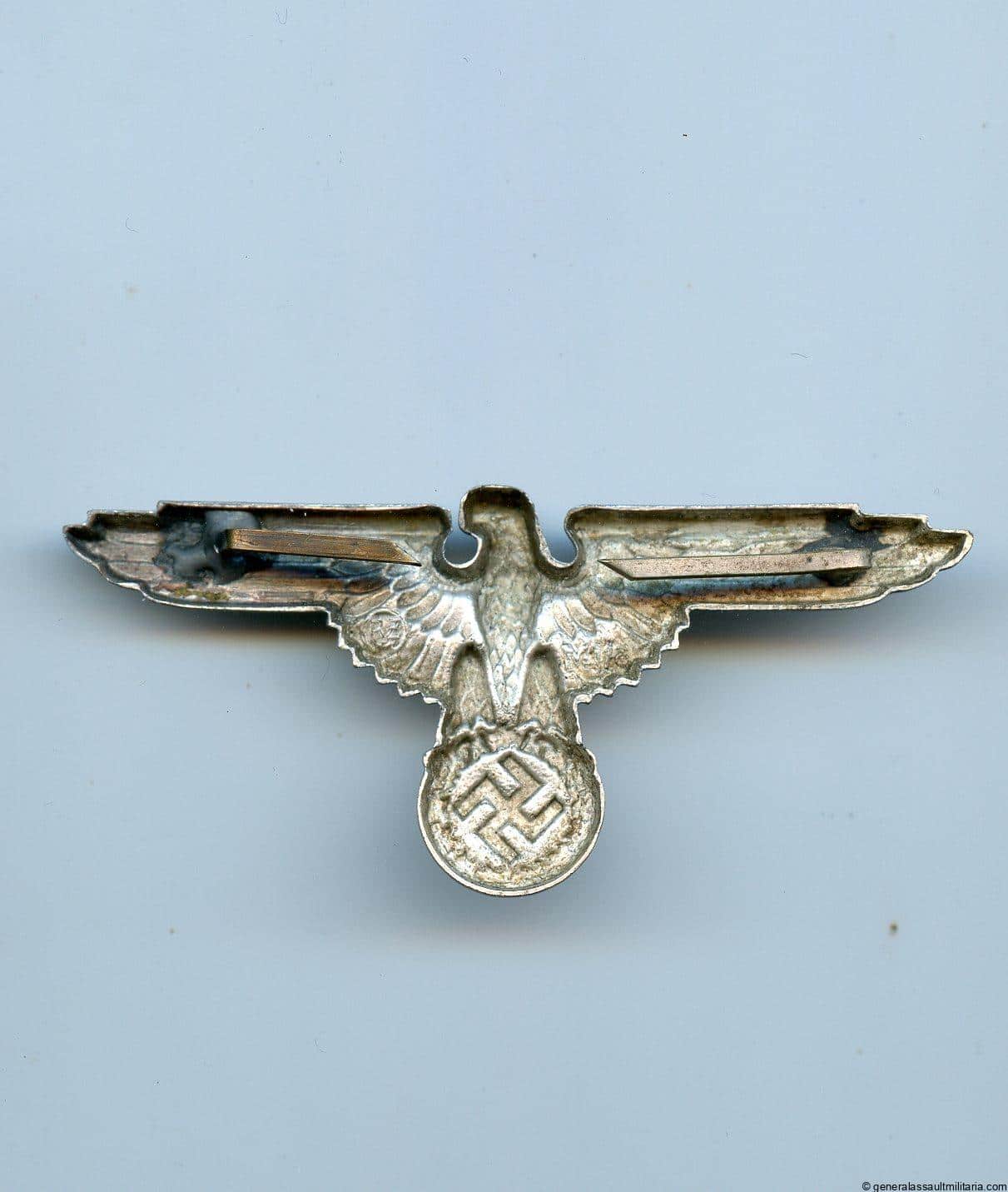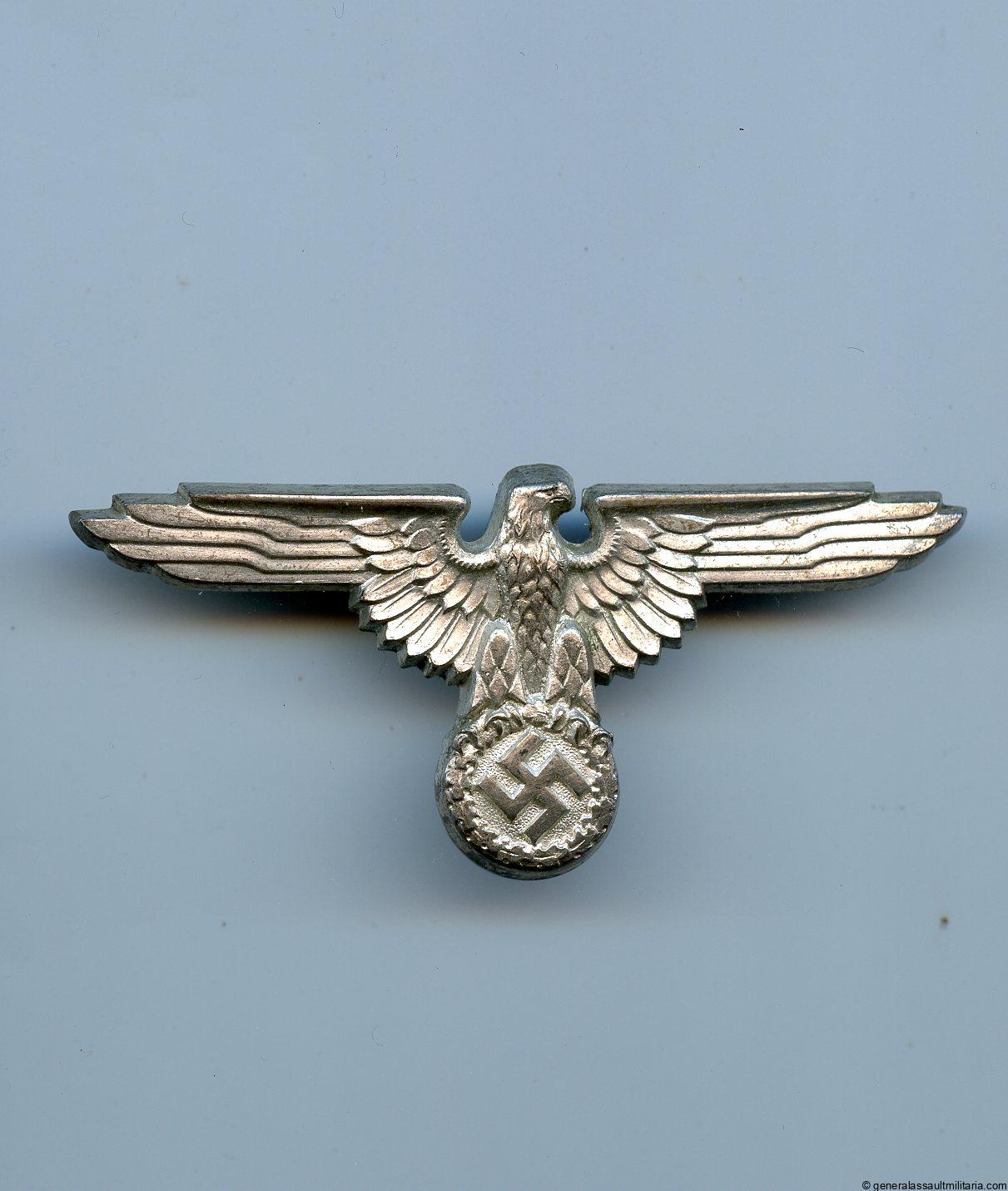SS visor cap eagle – M1/8 Ferdinand Wagner, Pfrozheim. Cupal construction eagle with bright silver finish and soldered on prongs with one repaired. Remains in unworn to lightly worn condition and shows most of the finish remaining with a typical patina on the back. Maker marked with the RZM M1/8 mark on the back for Wagner. Good looking SS cap eagle with one repaired prong.