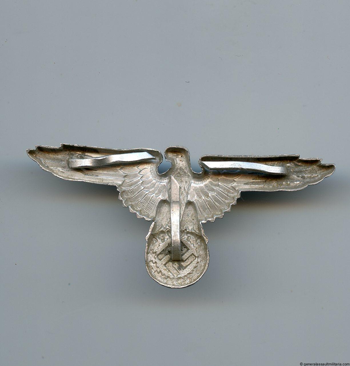 SS visor cap eagle – RZM M155/38. Early pre war 1938 aluminum construction with RZM M155/38 mark on the wing. Remains in worn condition with a slight patina. Killer example with lots of character, rare variant!