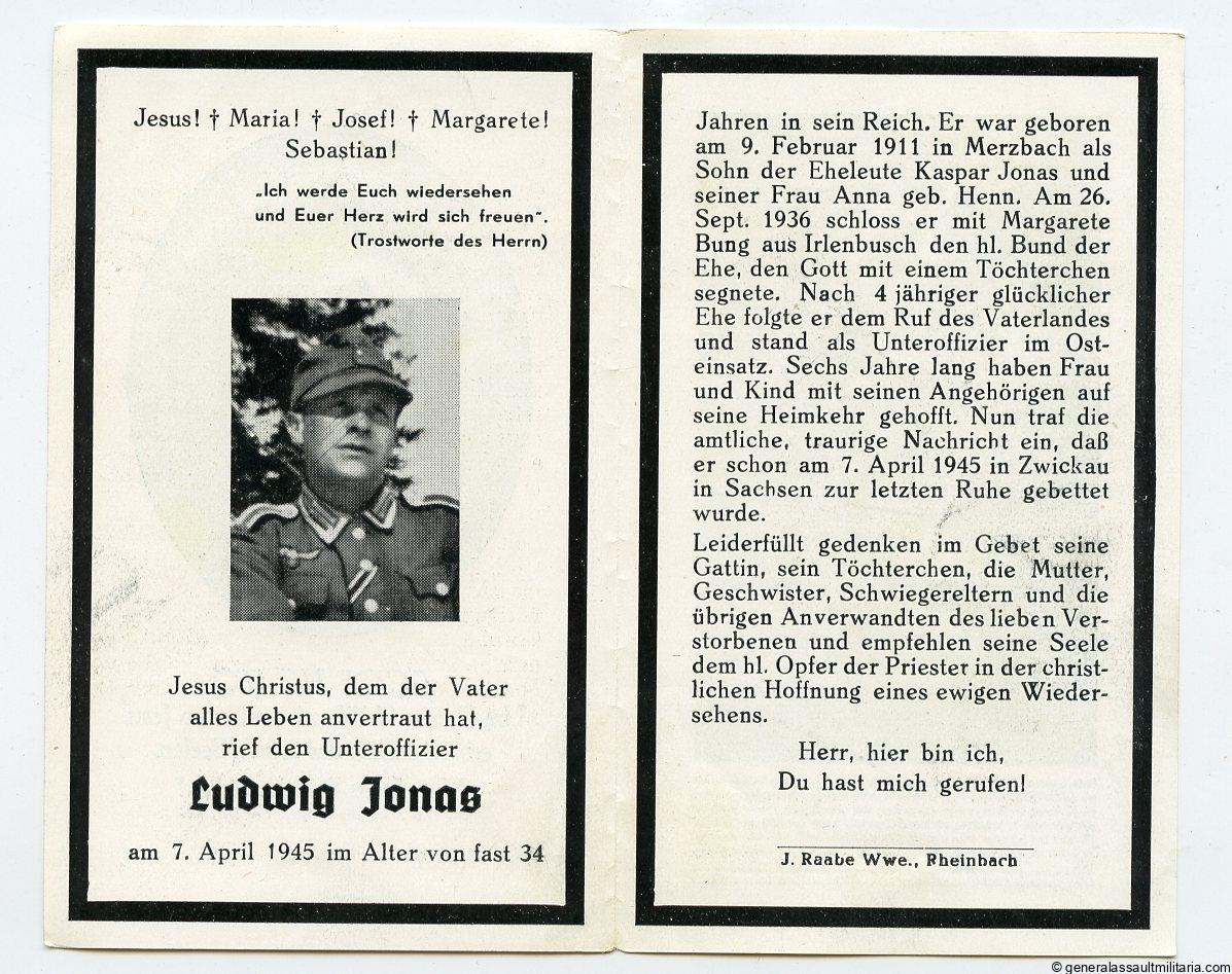 Sterbebild Ludwig Jonas – 7.4.45 Zwickau. Death card to Ludwig Jonas killed very late in the war most likely by US forces in this area who fought in this area near the end of the war. With photo the Unteroffizier.