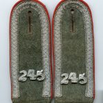 Pair of matchting Stug/artillery shoulder boards. Well constructed boards with Feldgrau cloth, bright red rayon piping and aluminium Numbers. The boards show nice age and wear to them but remain in good condition. These boards belong to a member of the 245 artillery regiment or Stug Abt. 245. Impossible to say which of the two, but both the units have an interesting history. The Stug Abt being destroyed at Stalingrad and rebuild in 1943. The Art. Reg. 245 was formed in France Late 43 and fought in Normandy, Belgium, the Netherlands near Tilburg and Breda and Nord germany near the end of the war.