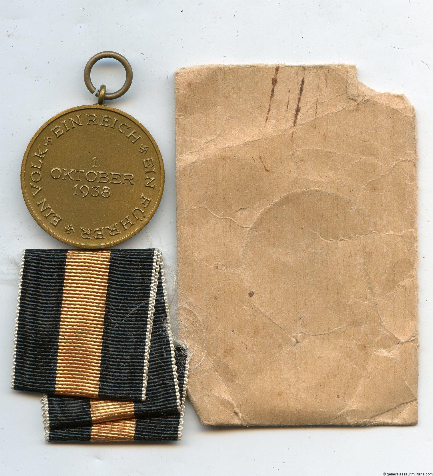 Sudetenland annexation medal set – Rudolf Bergs, Gablonz. Tombac Sudetenland Anschluss Medaille in perfect mint condition, all the bronze finish perfectly preserved. Comes with matching orange black ribbon and Rudolf Bergs packet. Packed was opened at the top and has a corner missing. Excellent set with the award being in factory new condition.