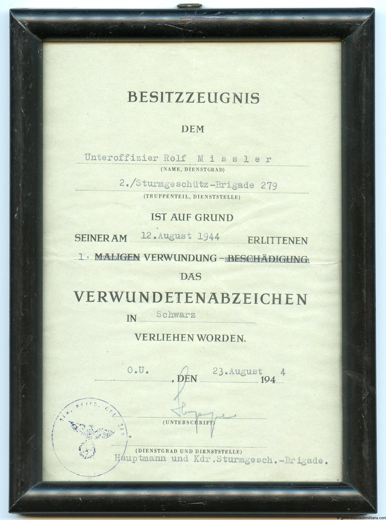 Two framed award documents Sturmgeschütz brigade 279. Two award docs to Uffz Rolf Missler who served with the 2./Sturmgeschütz-Brigade 279. Consists out of a framed Wound badge black document dated 23.08.44, singed by the units commander Hauptmann Hoppe, and his Ek2 document dated 01.09.44, singed by Generalmajor Siegfried Hass recipient of the knights cross.
