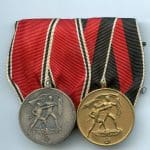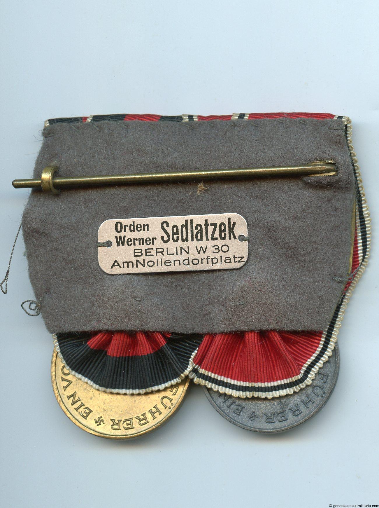 Two piece medal war with annexation medals – Werner Sedlatzek, Berlin. Good looking Austria and Sudentland annexation medal bar with Sedlatzek plate sewn to the back. Quality medal bar with interesting makers tag.