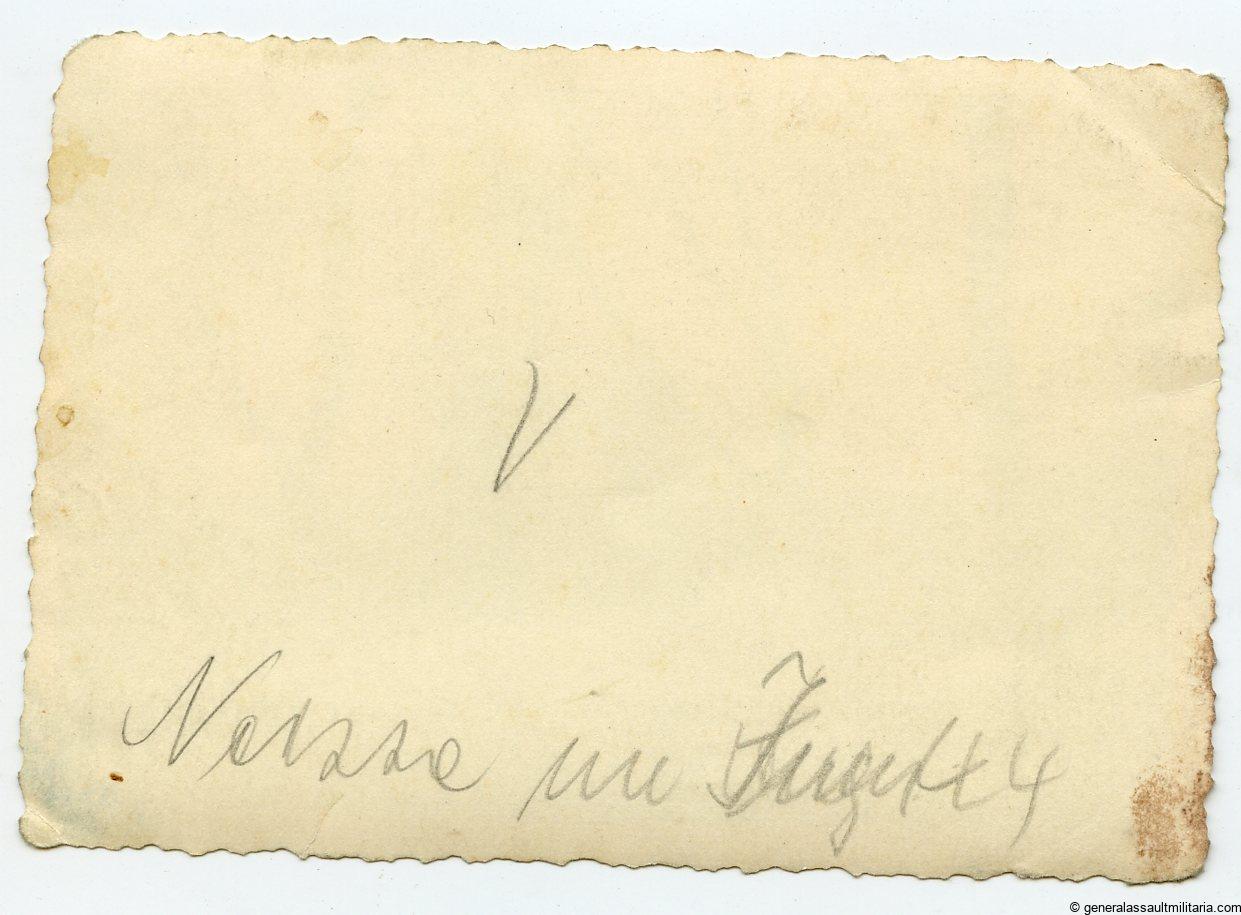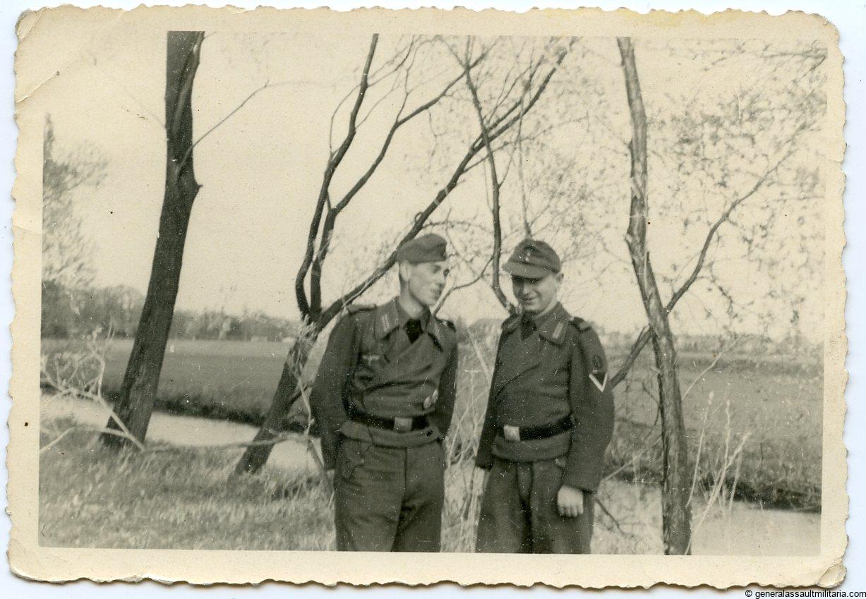 Two soldiers wearing Stug/Pzg type wrapper. Two badges badges in wear which are most likely the GAB and Wound badge. Good condition with some damage to the corners. 7×10 cm on unmarked period photo paper.