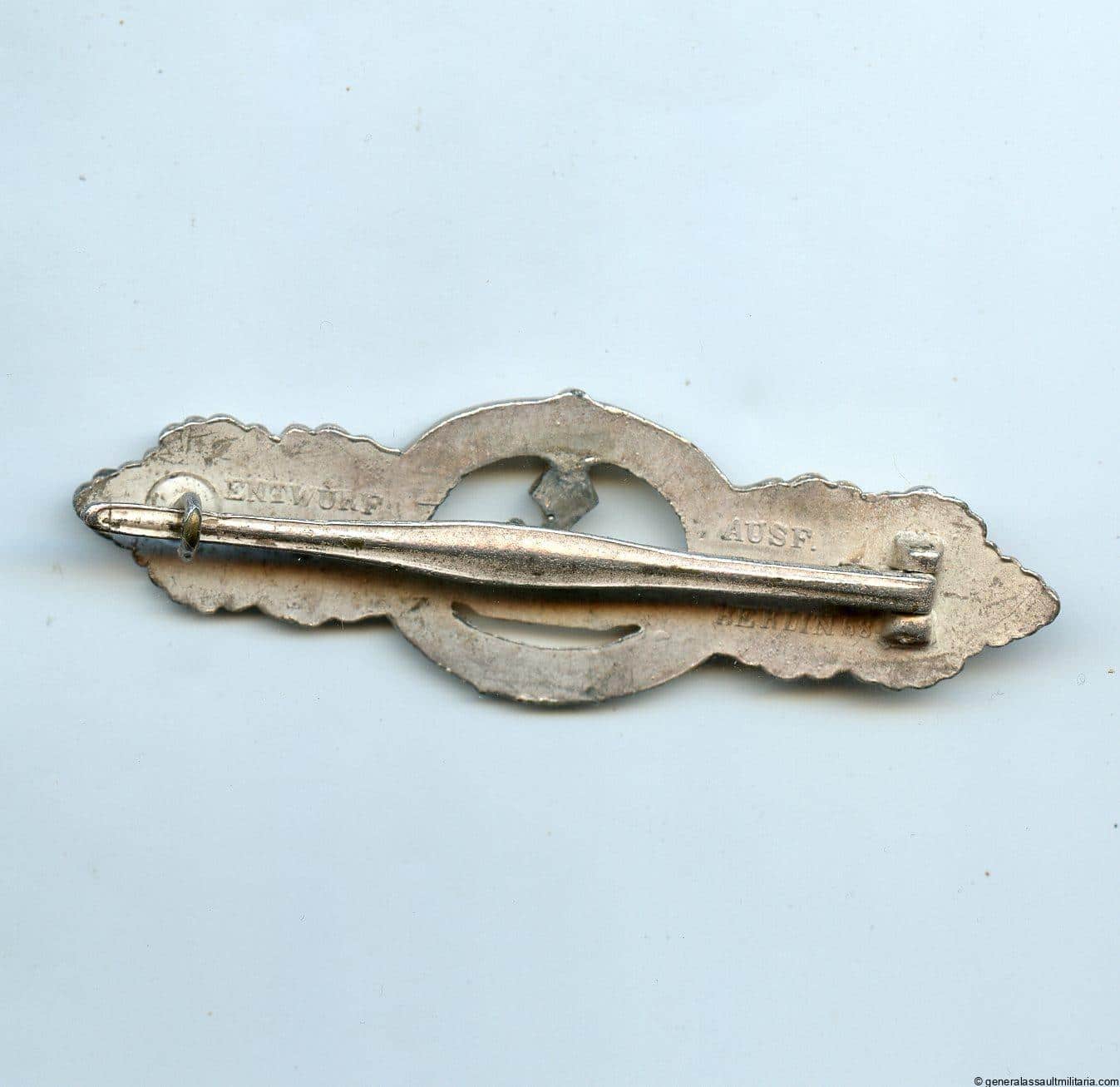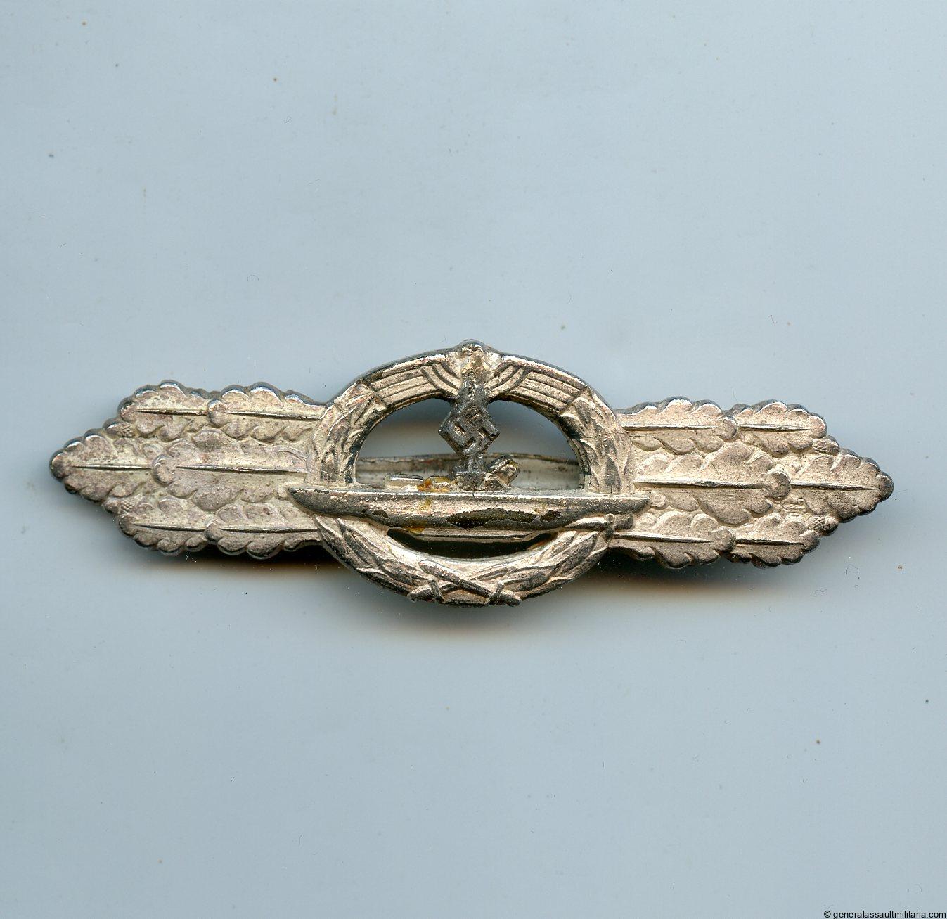 U-boat clasp in silver – Schwerin Berlin. Mid to late war solid zinc ‘U-Boot Frontspange in Silber’ with Schwerin makers mark and integral hinge and crimped in catch. Remains in stunning condition with very minimal wear and nearly all the bright silver plated finish still present. Shows some finish missing near the swastika and the U-boat with a small patina spot. Very uncommon and excellent example silver grade.