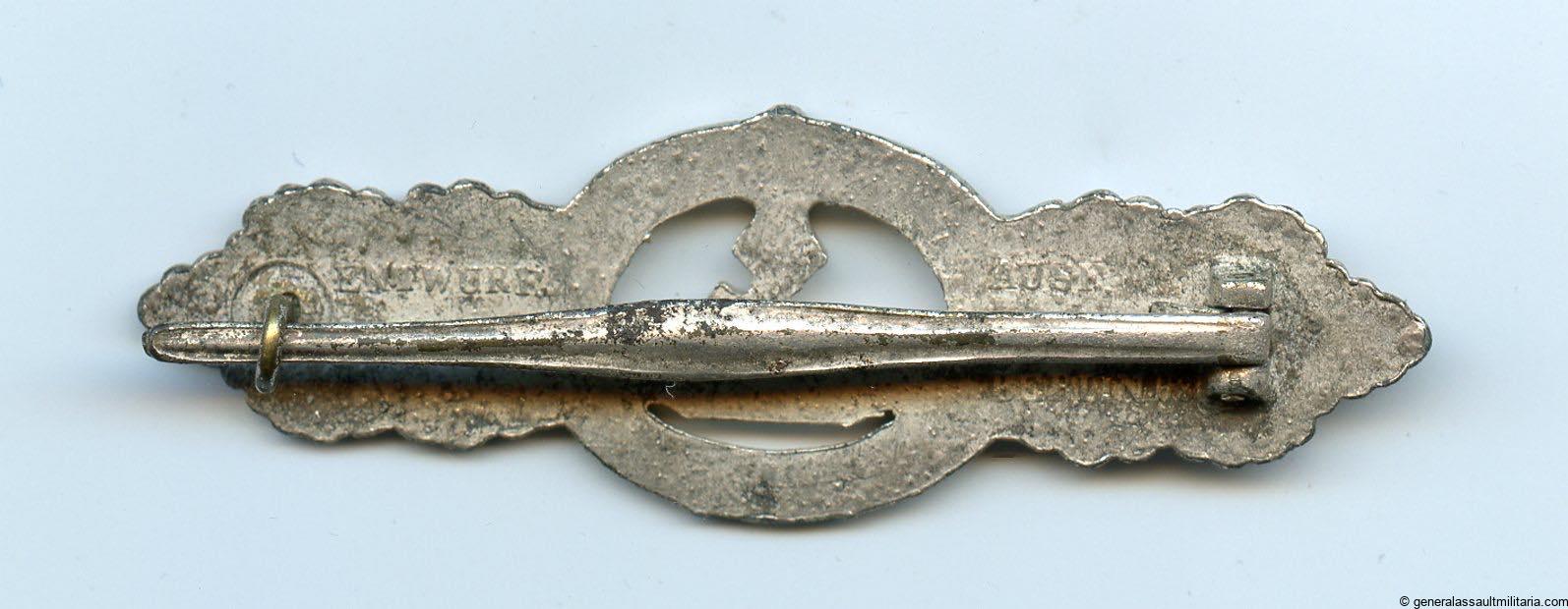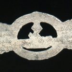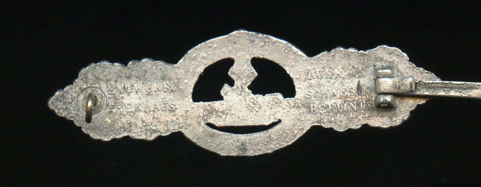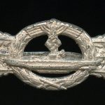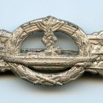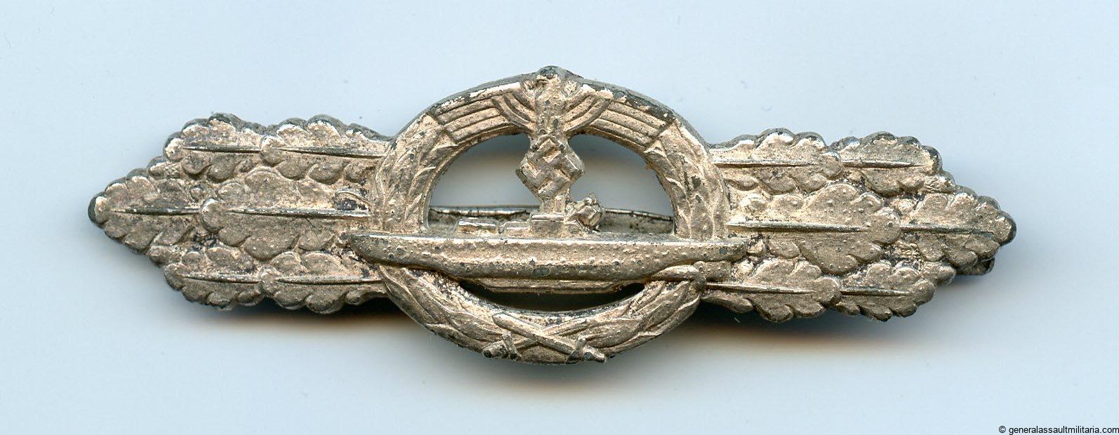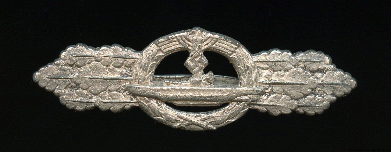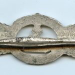 U-boat clasp in silver second pattern – Schwerin & Söhne, Berlin. Solid zinc second pattern ‘U-boot spange’ designed by Peekhaus and only produced by the maker Schwerin for U-boat personal. The badge has its typical crimped in catch and integral hinge system. The silver plated finish shows typical zinc bubbling and is often encountered on these clasp, but its also possible to find these with a silver wash type finish. The clasp shows some sings of moderate wear and has held its finish very well, its almost fully present. Quite difficult to find and sought after ‘Kriegsmarine’ badge. No damage or repairs on this good looking clasp. One of the rarer KM badges out there.