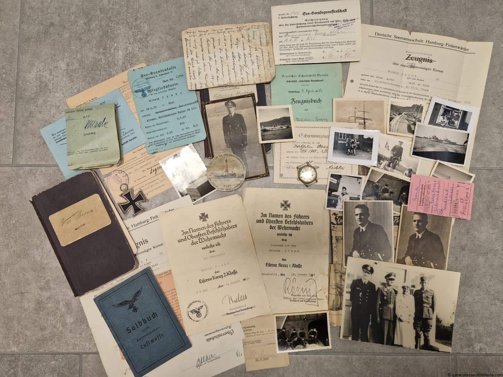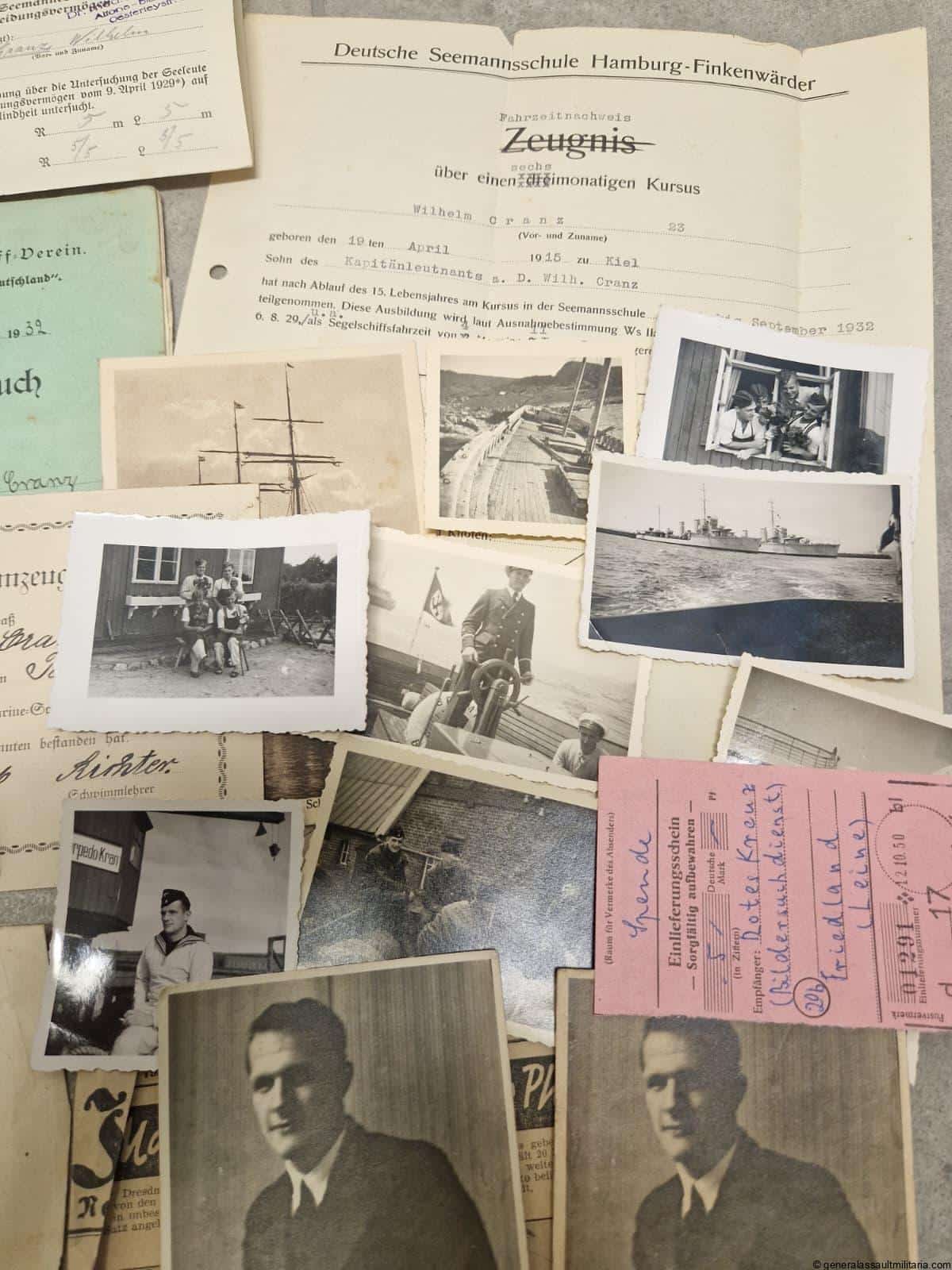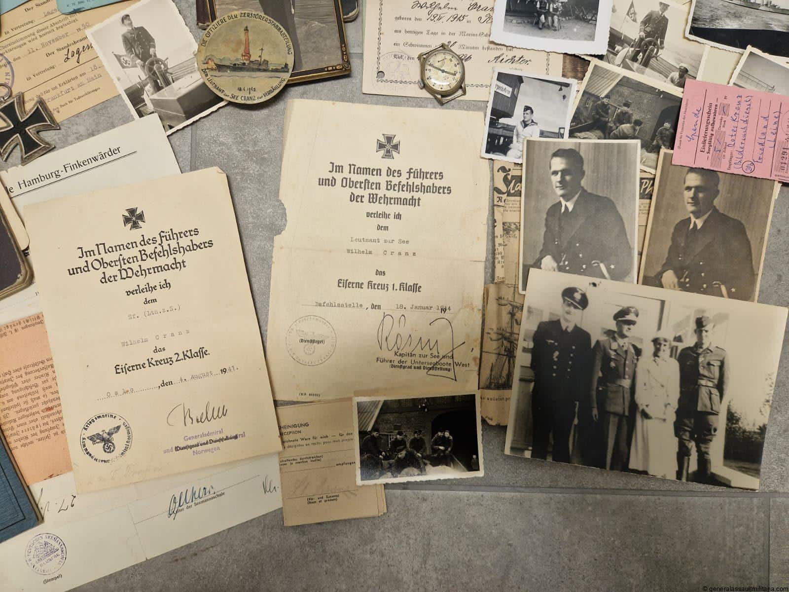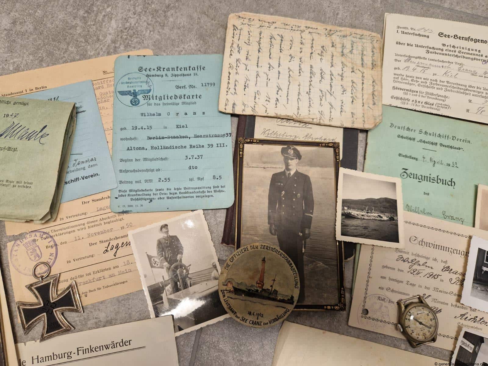 U-Boat commander Wilhelm Cranz grouping. Rare grouping to the KIA commander of U-398 Leutnant zur See Wilhelm Cranz. Cranz was awarded the Ek2, Ek1, U-boat badge and Front clasp. Wilhelm Cranz sailed on his first patrol as commander when he took his type VIIC boat U-398 out from Horten, Norway on 14 April 1945 (Busch & Röll, 1997). His boat went missing on or after 17 April in the North Sea (Niestlé, 1998). He would have been 30 years old few days later. (https://uboat.net/men/commanders/177.html)