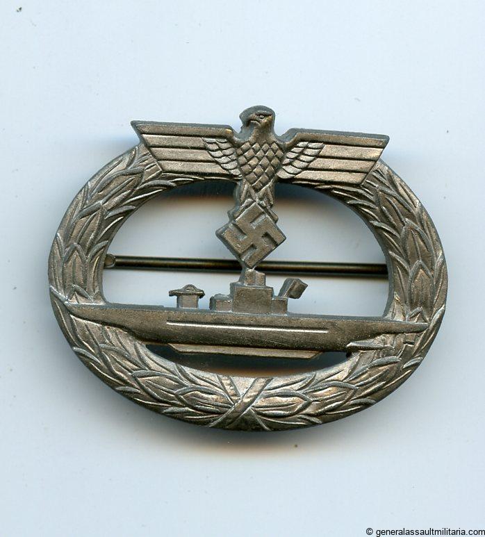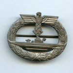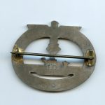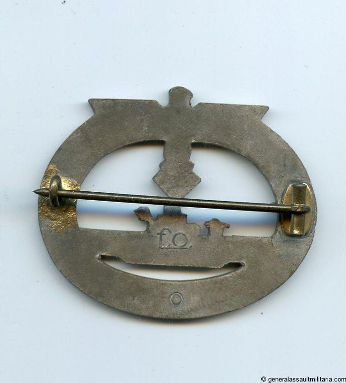 U-boot badge – Friedrich Orth, Wien. Zinc U-Boat badge maker marked with the FO logo. The badge lost most of its gold finish but still shows a bit of a golden glow on it. A small hole was designated to be drilled out to fit the catch. But the makers chose the horizontal setup over the vertical in this case. The small hole allowed for a good direct soldering of the catch, unlike most other makers that used a base plate to attach catches properly. No damage or repairs on this nicely marked U-boot badge.