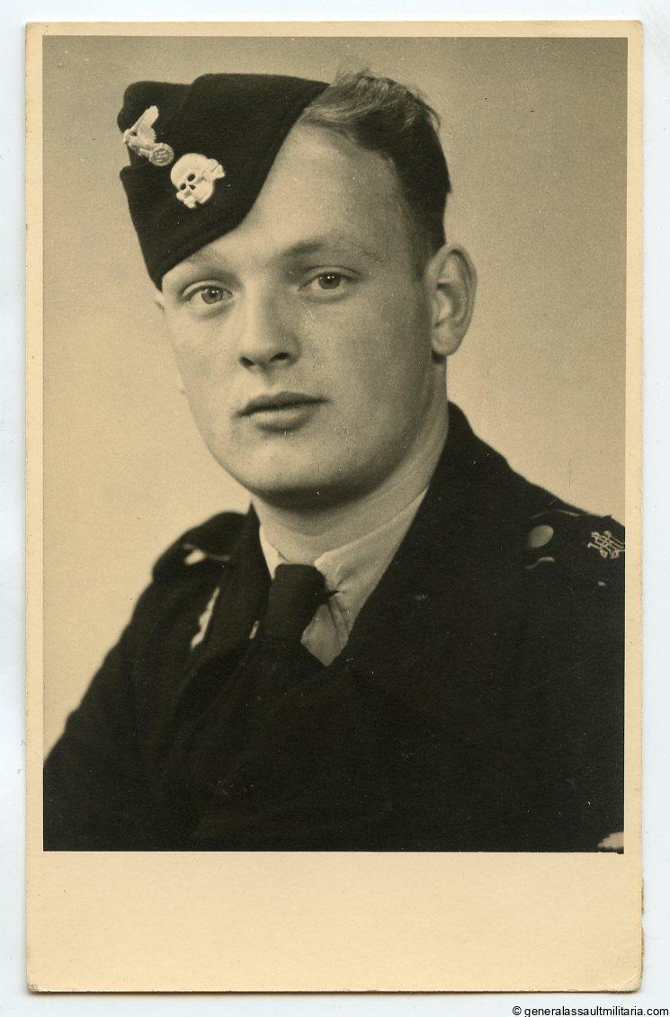 Waffem-SS LAH panzer portrait. Shows a young Leibstandarte Adolf Hitler member with LAH slip ons and metal cap insignia on his side cap. Postcard size portrait on Leonar paper, with atelier stamp on the reverse. Excellent condition.