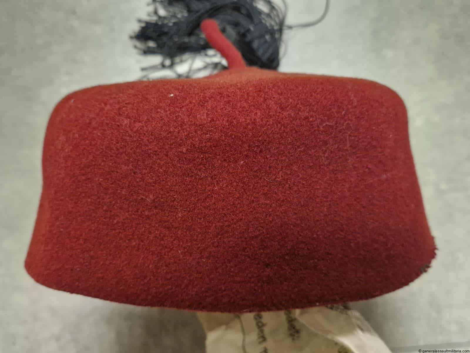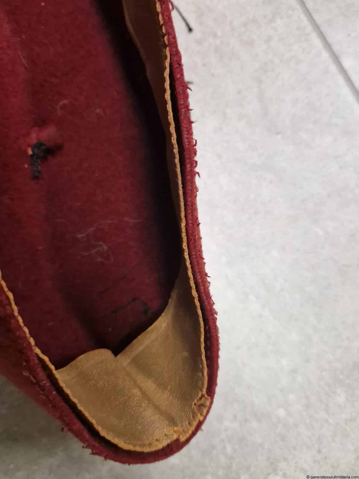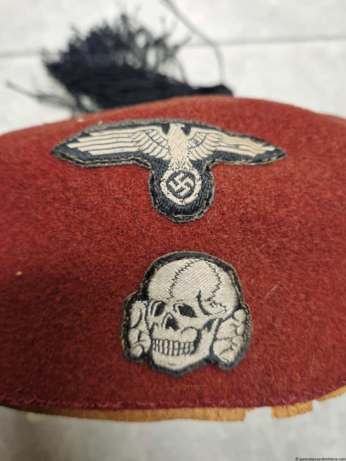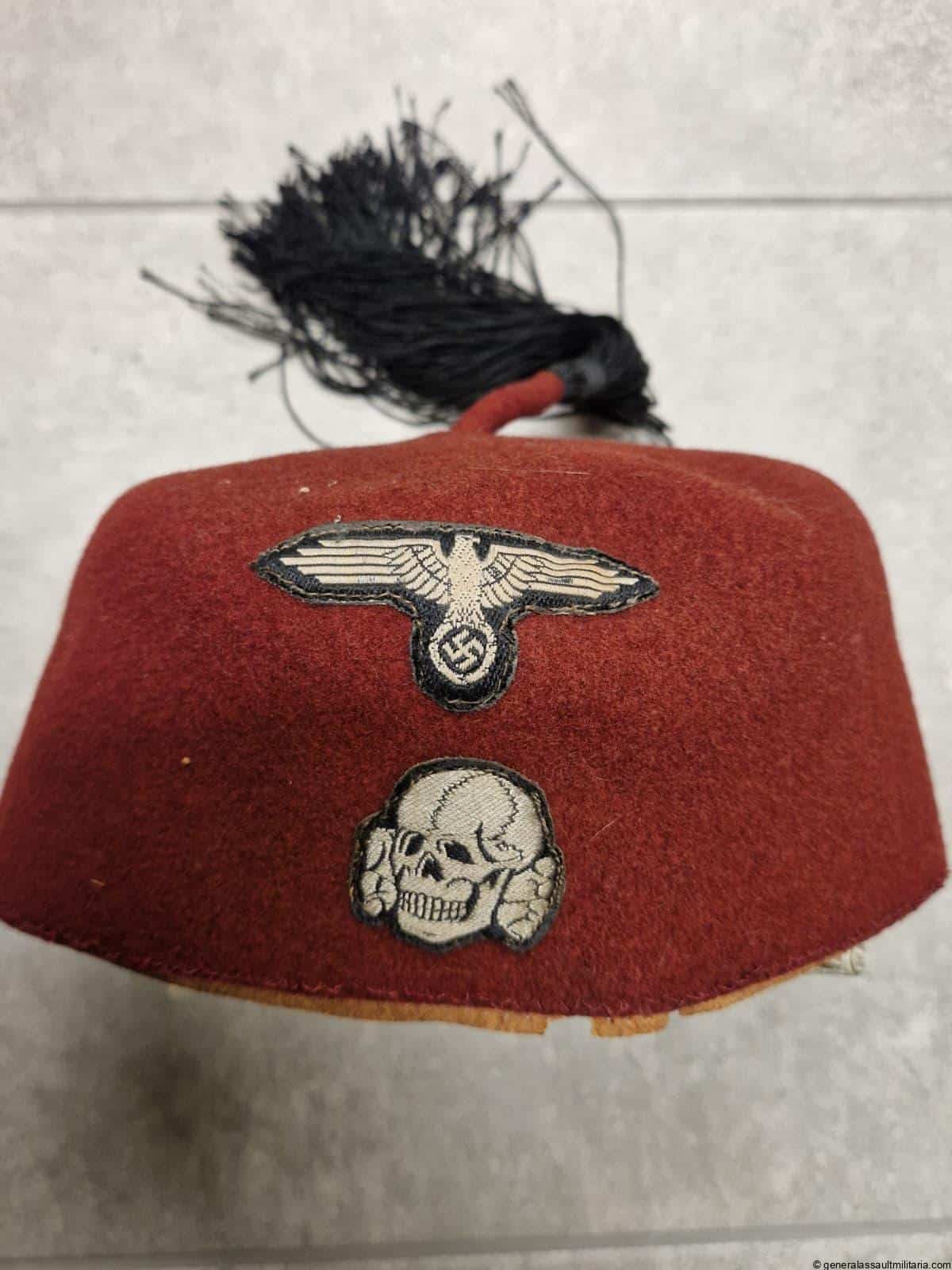 Waffen-SS 13.Gebirgs-Division “Handschar” Fez. Maroon color Fez as worn by the members of the 13th SS division. Remains in used condition with some separation on the stichting of the typical light brown sweat band. Both eagle and skull are the correct original sewn type with the padded reverse. Excellent worn example that is not so easily found and often has the insignia removed.