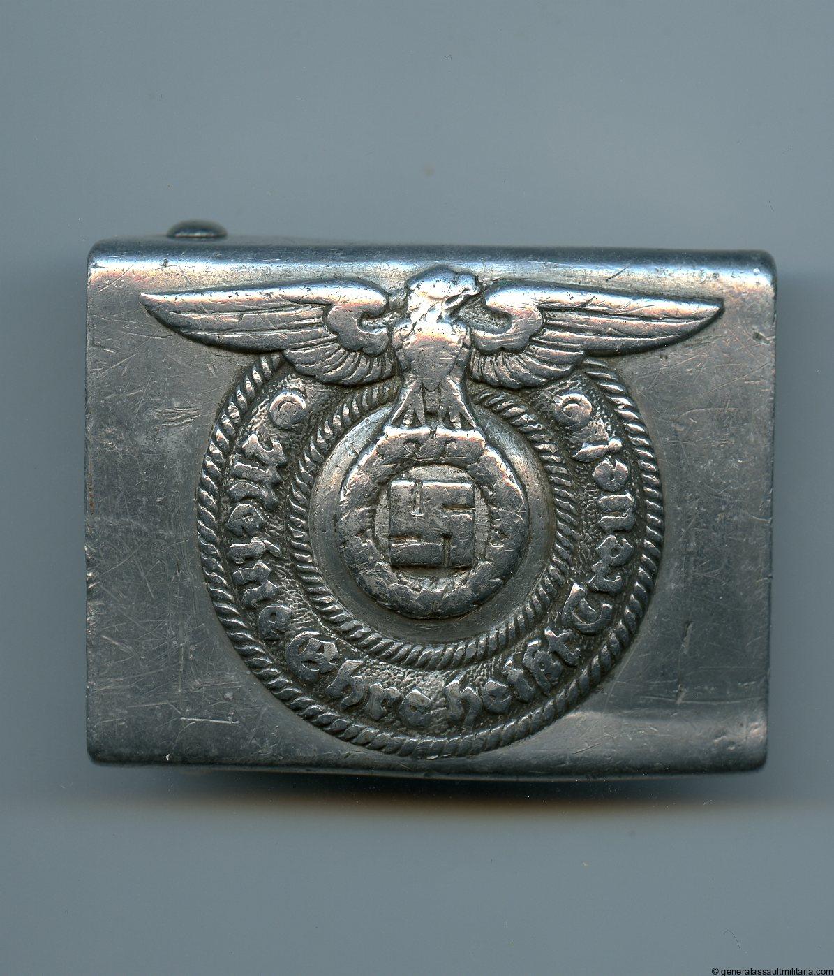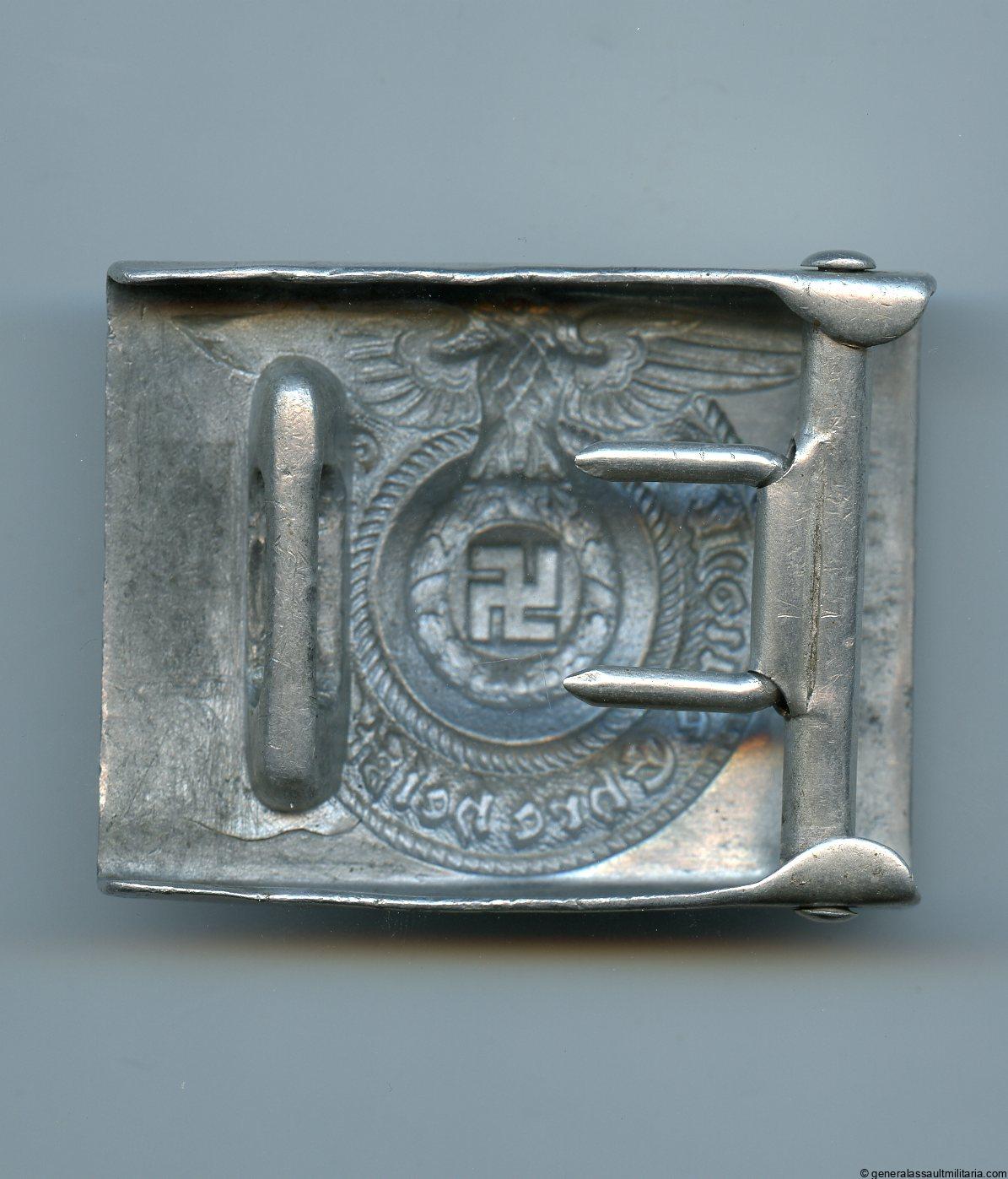 Waffen-SS buckle – RZM 36/38 Overhoff & Cie, Lüdenscheid. Early pre war 1938 aluminum construction Overhoff & Cie produced SS buckle. Remains in well worn condition with some of the eagle details worn down and scratches on the front. Maker marked with the RZM 36/38 SS mark under the prongs. Prongs are in good undamaged condition.