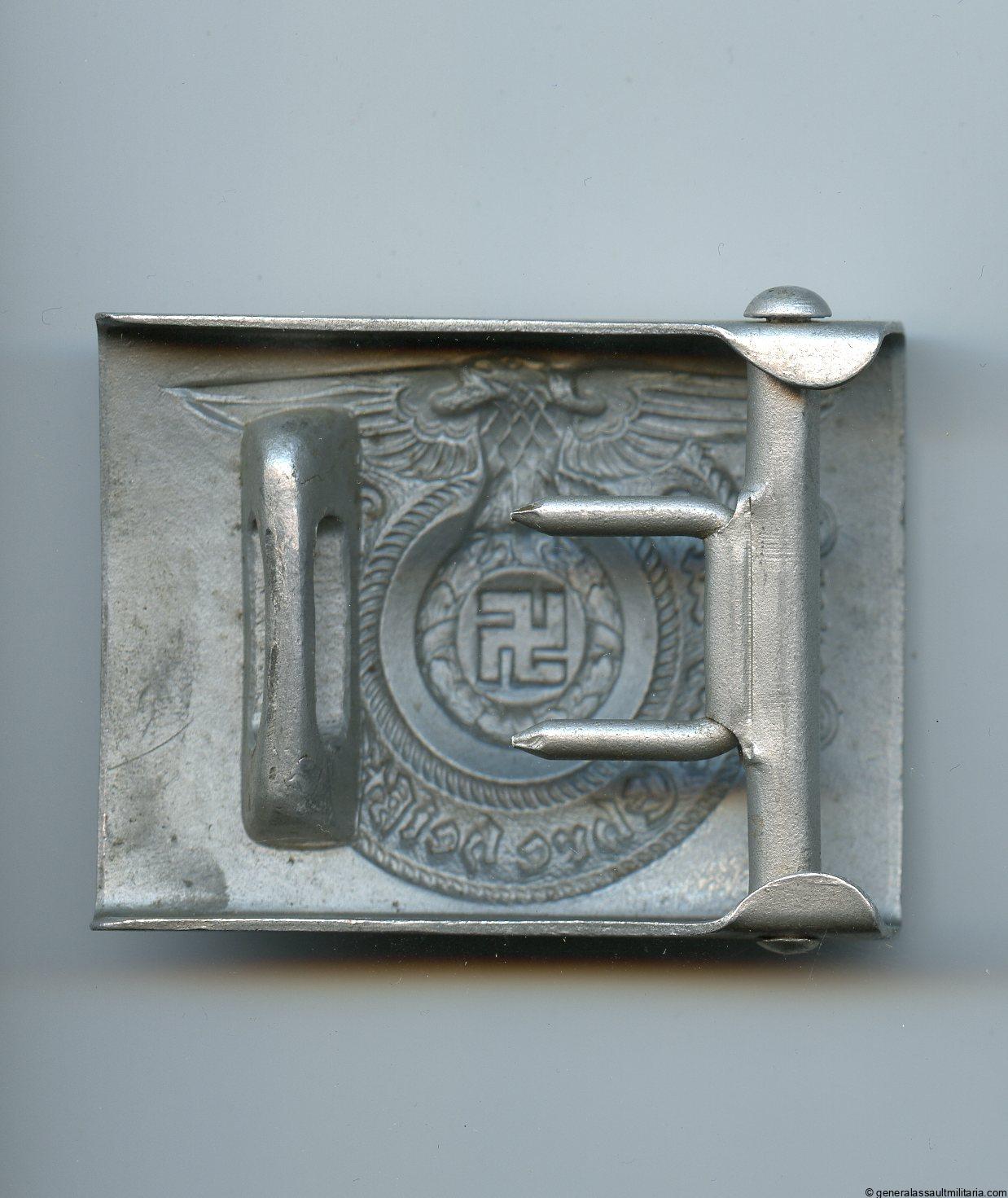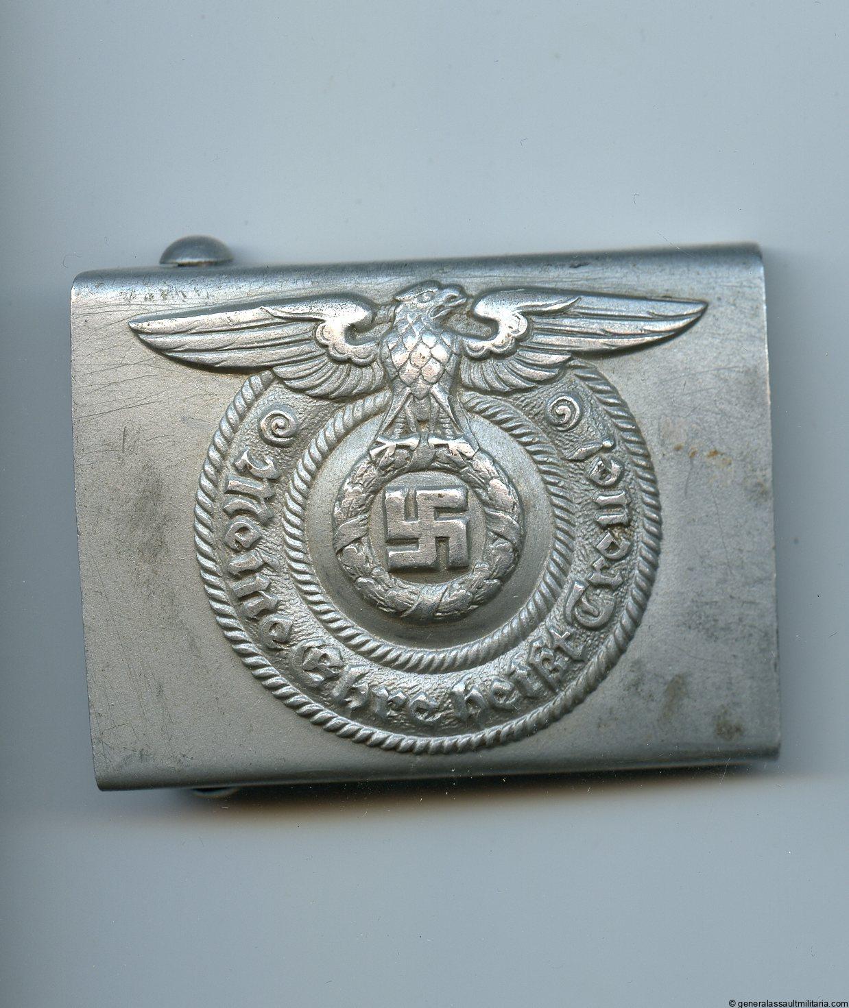 Waffen-SS buckle – RZM 36/40 Overhoff & Cie, Lüdenscheid. Very uncommon pre war Aluminum construction buckle with Overhoff 1940 rzm mark. Remains in excellent very lightly worn condition with all the details nicely preserved and minimal wear. The last year the buckles were made in aluminum before the production was changed to steel. Uncommon SS buckle and difficult to upgrade, top condition.