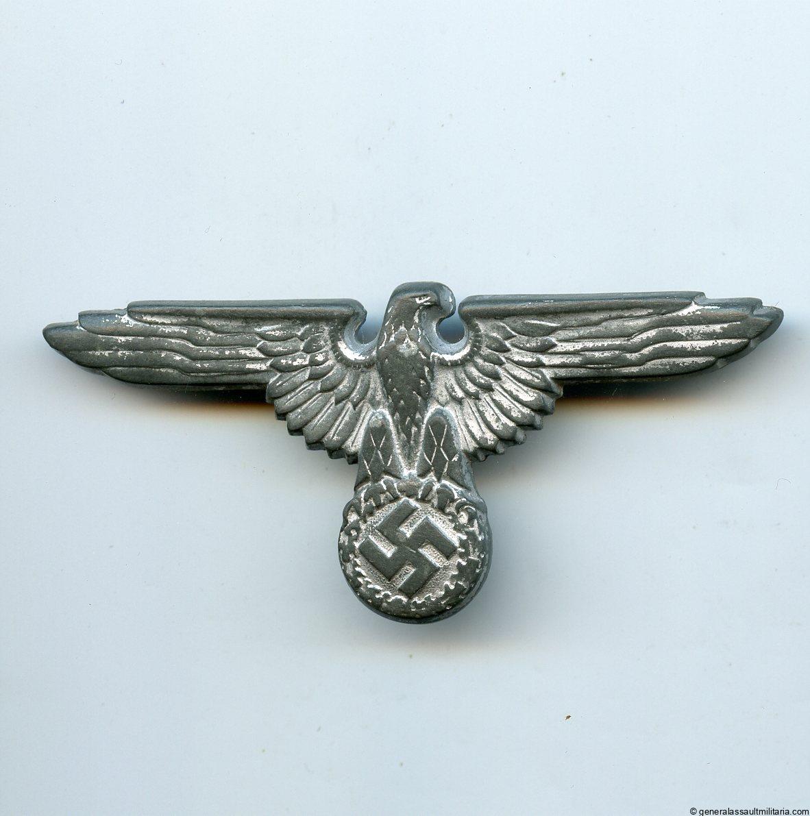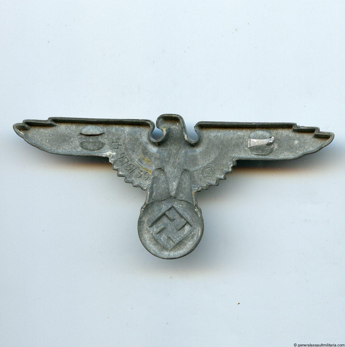 Waffen-SS cap eagle – RZM 475/39 Ferdinand Wagner, Pforzheim. Zinc construction RZM marked SS eagle from wagner with silver finish. Remains in well worn condition and has both prongs missing but the crimps still intact. Great worn eagle that has become very difficult to find.