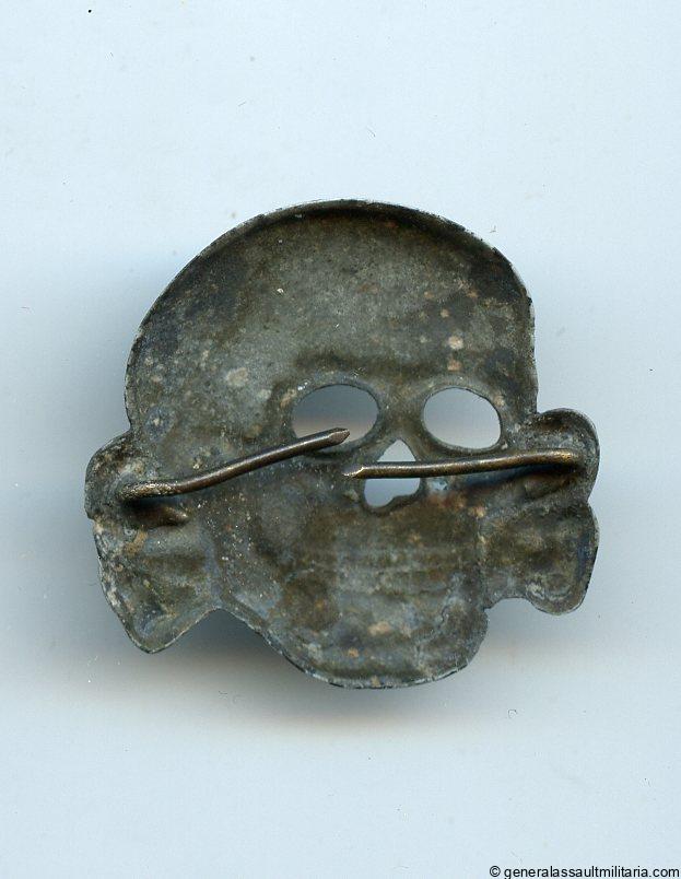 Waffen SS cap skull – Assmann & Söhne, Lüdenscheid. Late war hollow zinc Assmann design skull with round wire soldered prongs. Remains in good condition with some age to it it, both prongs are still nicely attached. Excellent late war totenkopf.