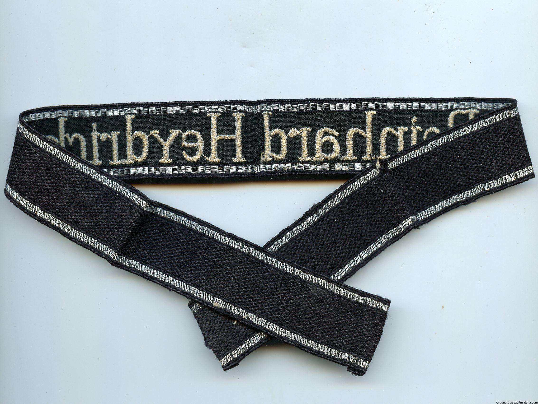 Waffen-SS cuff title – Reinhard Heydrich. RZM type cufftitle with 7 silver wire border and woven lettering. Remains in uniform removed condition but retains its full length. Honorary cuff title that was worn by members of the SS Gebirgsjäger Regiment 11 “Reinhard Heydrich”. Excellent cuff title with minimal wear!