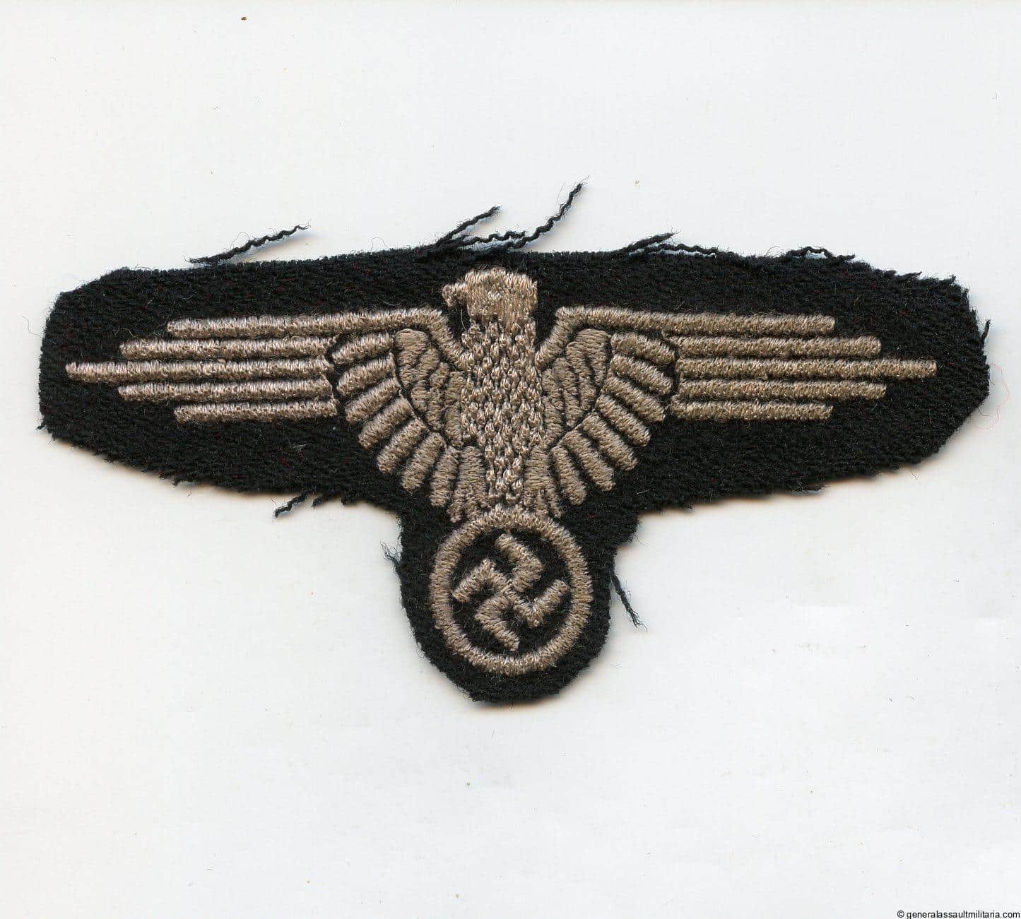 Waffen-SS EM/NCO sleeve eagle – RZM type. Black wool with machine woven eagle in unworn condition. Very well preserved RZM variant example.