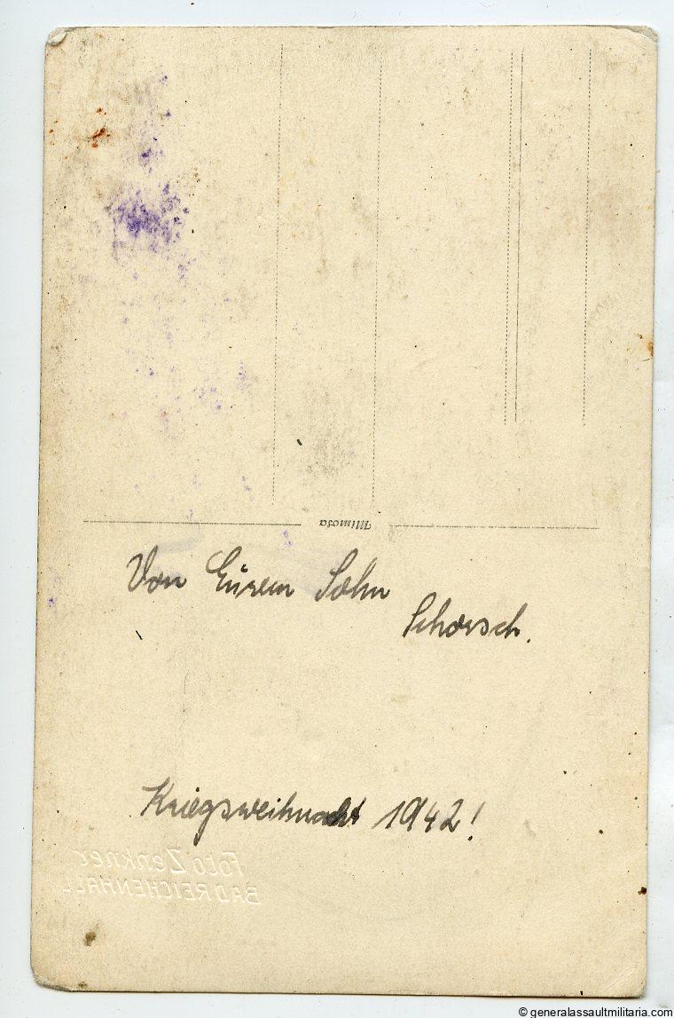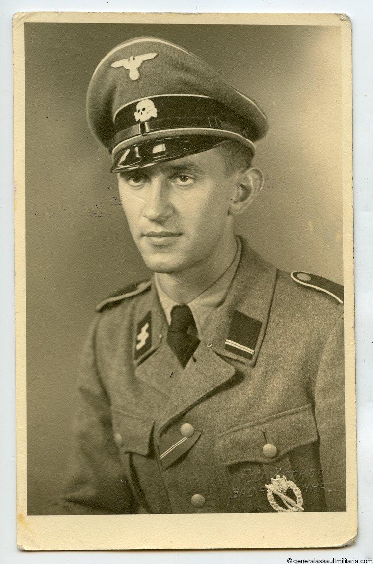 Waffen-SS named portrait with IAB and WBB in wear. Beautiful sharp portrait, postcard size, with EM/NCO cap in wear, IAB and part of the wound badge visible. Excellent condition, some wear to the corners, Mimosa portait paper, named on the reverse and dated 1942, with Badreichenhall atelier stamp.
