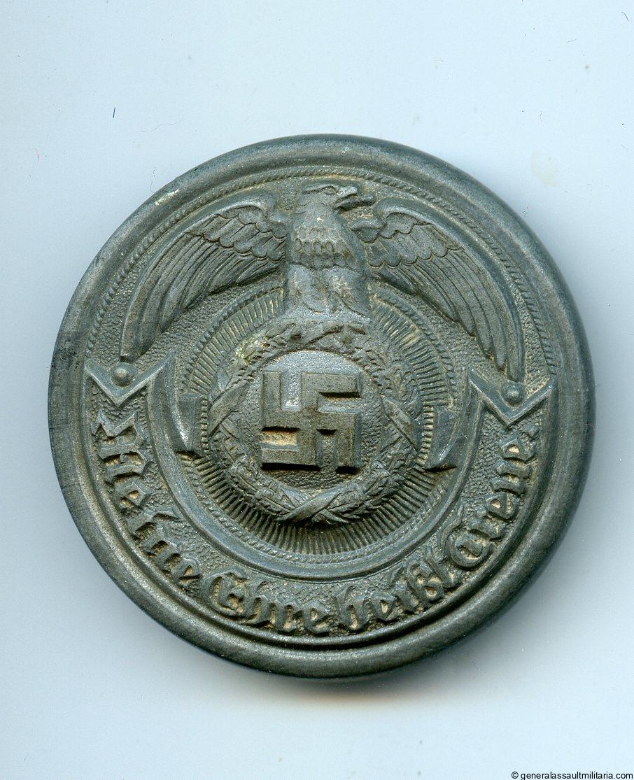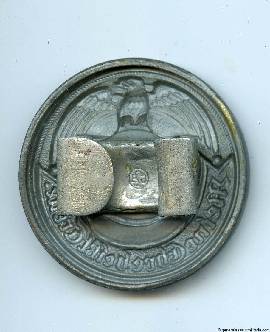 Waffen SS officer buckle – Emil Jüttner, Lüdenscheid. Mid to late war officer`s version Waffen-SS buckle with Emil Jüttner makers marked. Zinc construction with crimped in catch device. Remains in worn condition with normal signs of wear and age. Most of the finish has faded. The zinc prong part is missing.