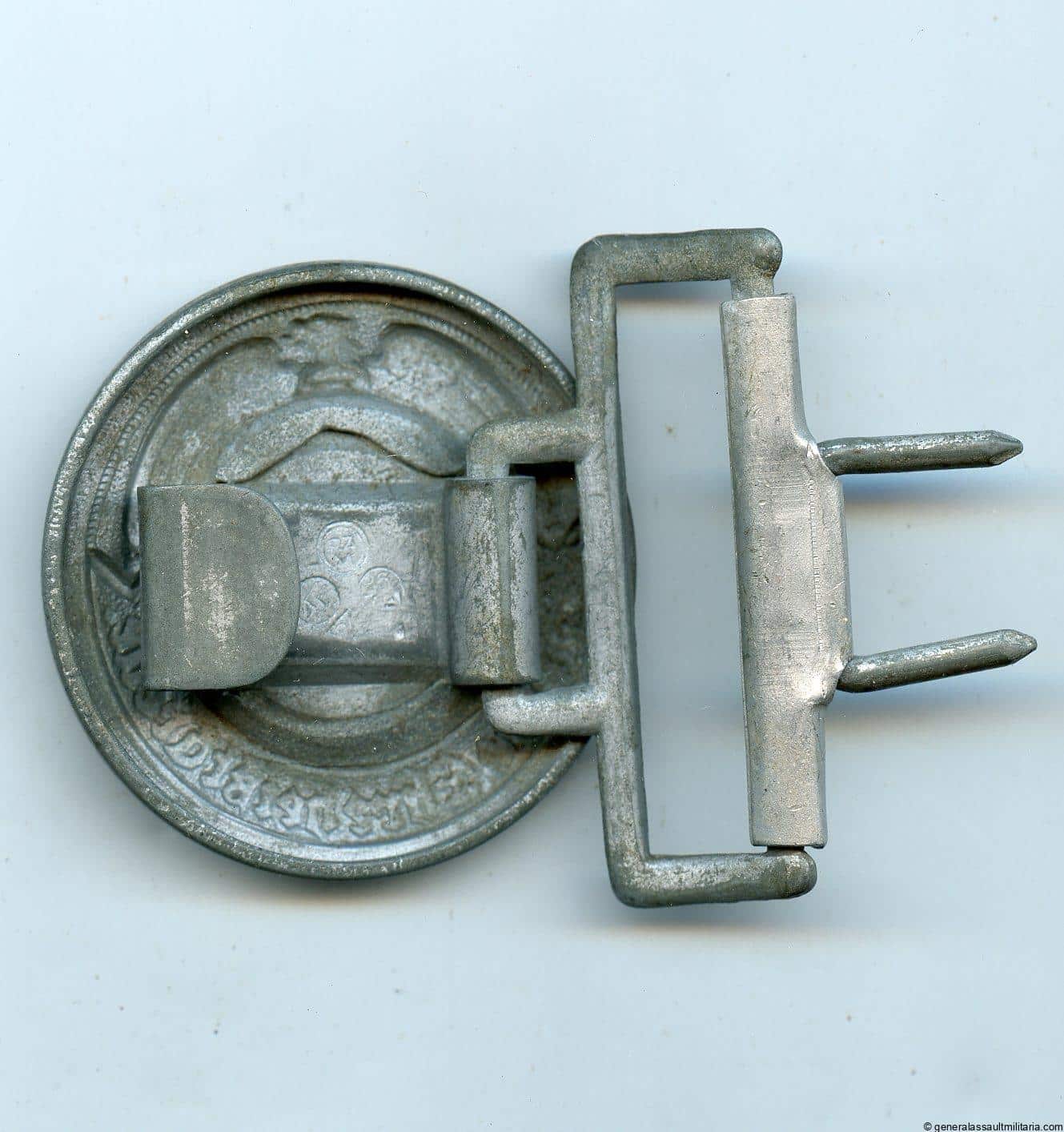 Waffen-SS Officer buckle – RZM 36/43 Overhoff & Cie, Lüdenscheid. Mid to late war zinc 1943 produced 36/43 marked SS buckle for officers. Remains in good lightly worn condition with most of the typical overhoff silver finish still remaining on both sides. The stamps on the bottom are a bit harder to read. The crimp is still tight and shows the original keep with prongs. Top zinc buckle.