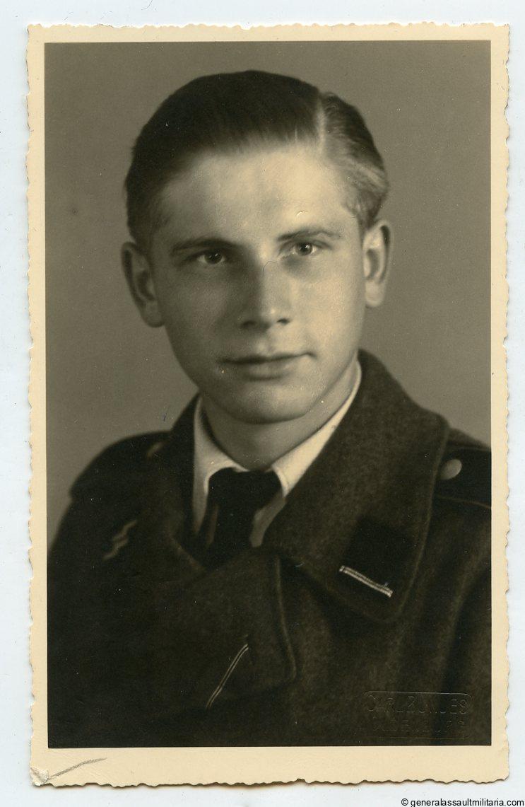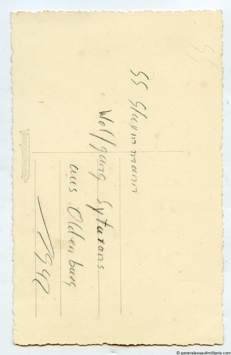 Waffen-SS Stug wrapper Sturmführer portrait. Postcard size portrait on Voigtländer portrait paper with Sturmgschütz wrapper in wear and Ost medal ribbon. Named on the reverse and dated 1942. Excellent condition with Oldenburg Atelier stamp in the bottom corner.