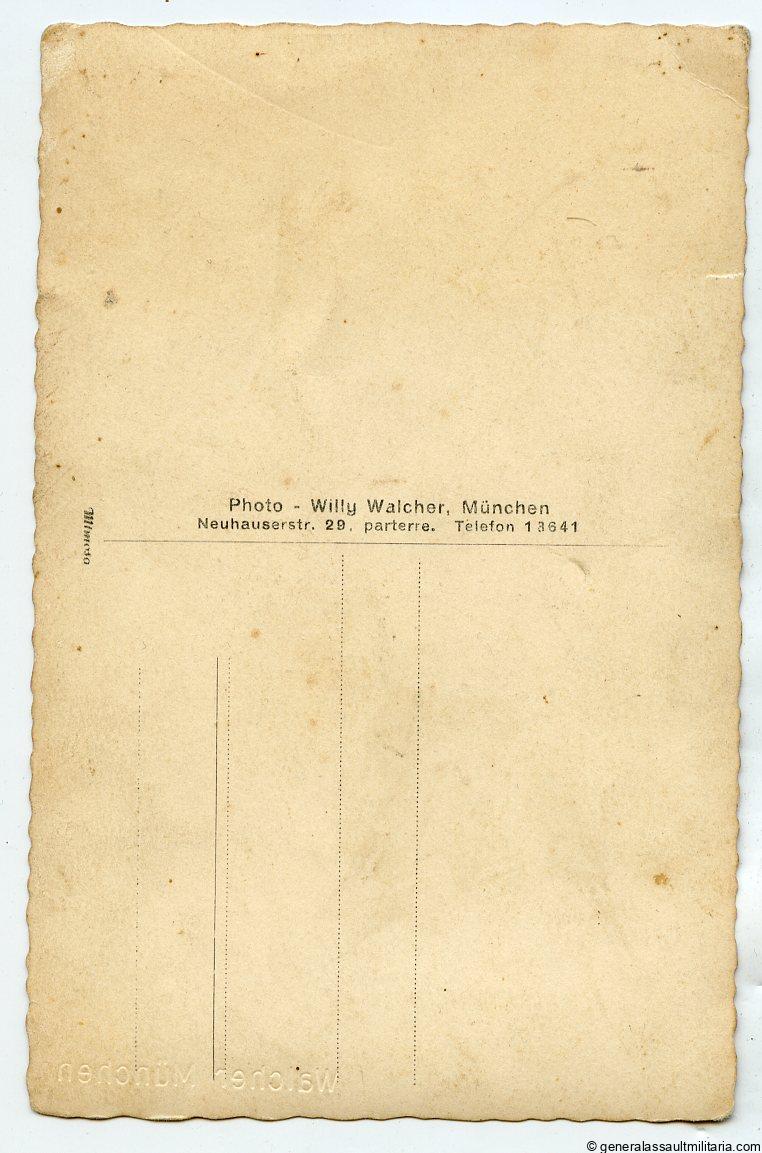 Waffen-SS Unterscharführer portrait with 1s on the shoulder straps. Interesting and sharp portrait with very rare shoulder boards in wear. Shows nice details on the visor cap, remains in good condition with some wear to the corners. Postcard size, atelier stamp from München and produced on a rare type of Mimosa portrait paper. Super portrait.