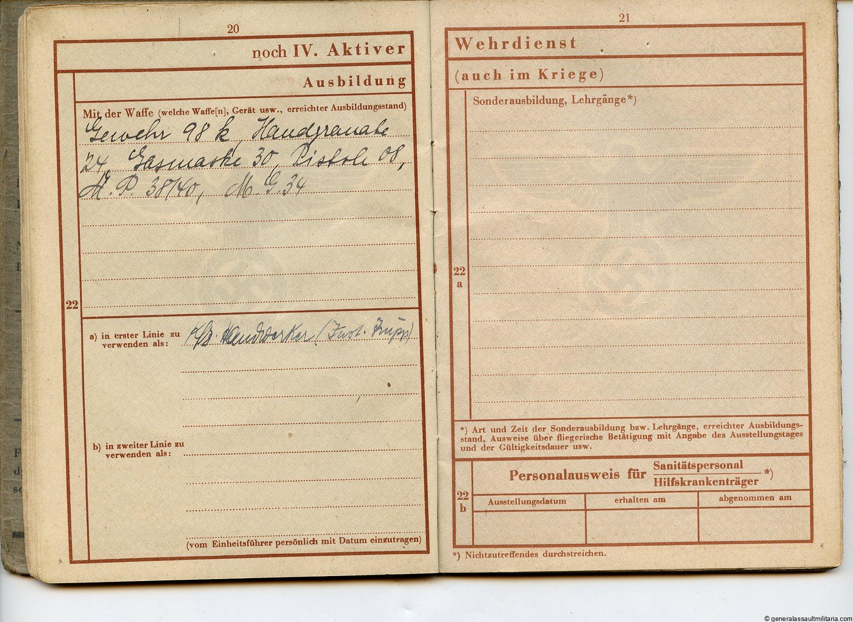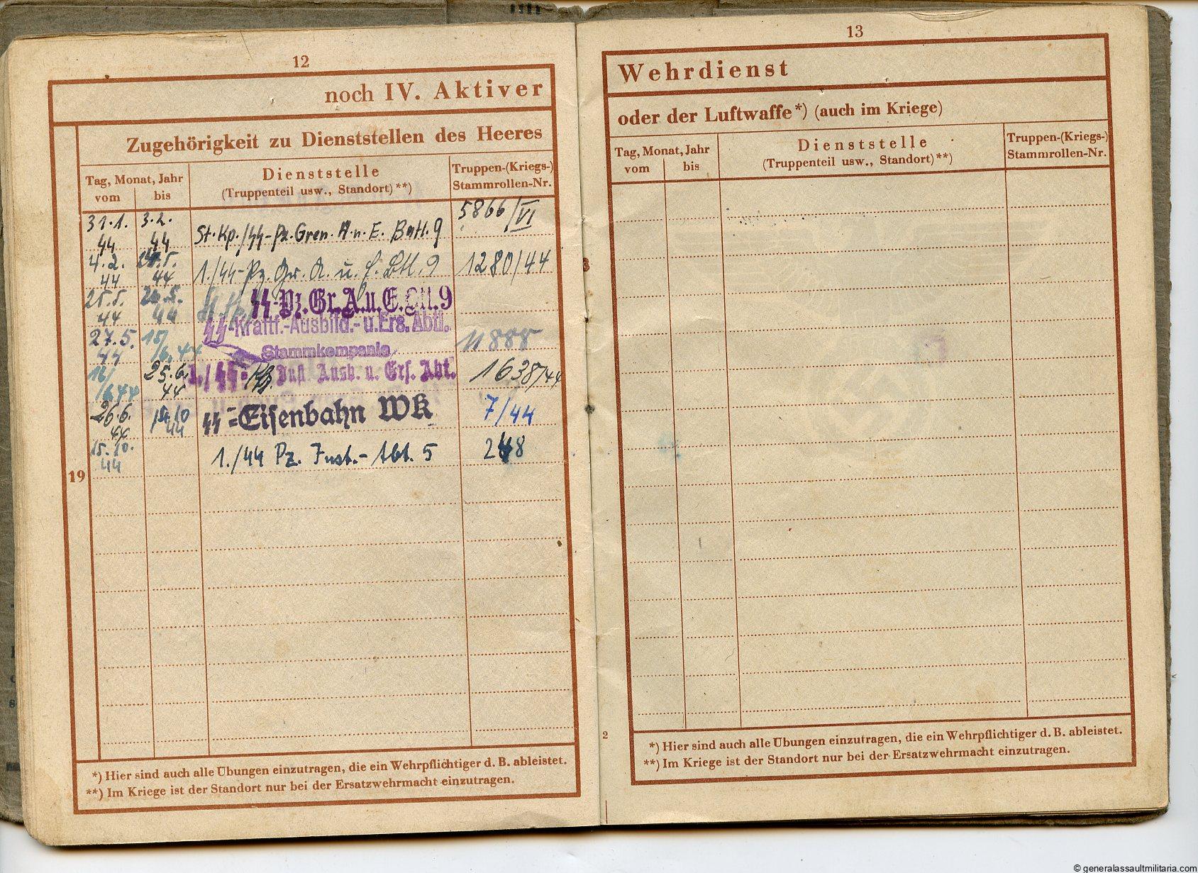 Waffen-SS Wehrpass – Kurt Heinberg. Interesting SS Wehrpass to a soldier that spent time at various training units. Units listed include SS Panzer Grenadier Ausbildung und Ersatz Bataillon 9, SS Ausb. U. Ers. Abt, SS Kraftfahr Ausbildung und Ersatz Abteilung, SS Eisenbahn WK and finally he was with the 1./SS Panzer abt 5. Some more entries, but no awards listed. All pages are present and remains in good used condition.