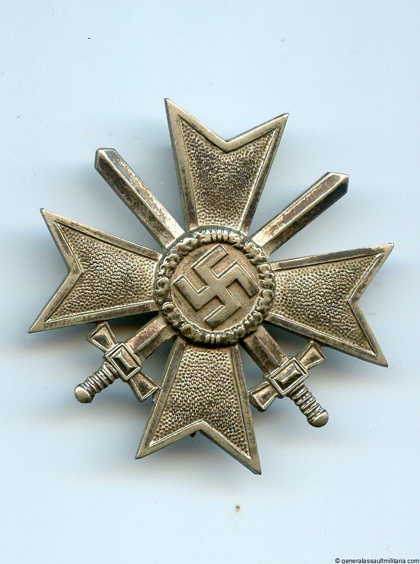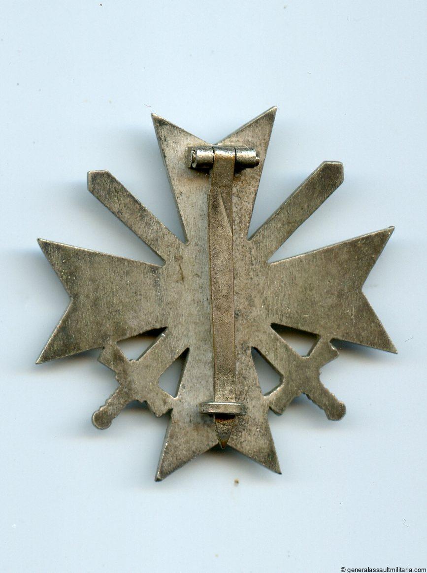 War merit cross with swords first class – Julius Bauer & Söhne, Zella Mehlis. Early tombac kvk1 with silver plated finish and frosting on top. Remains in lightly worn condition and shows a beautiful patina on the front with all silver plating intact. The back still shows the bright white top layer nicely and has the silvered pin patinated. Good quality early war merit cross. Unmarked example but known JB&Co product.