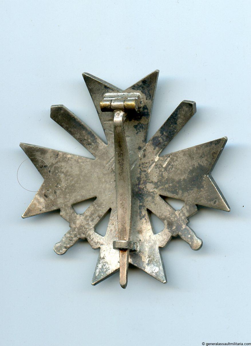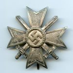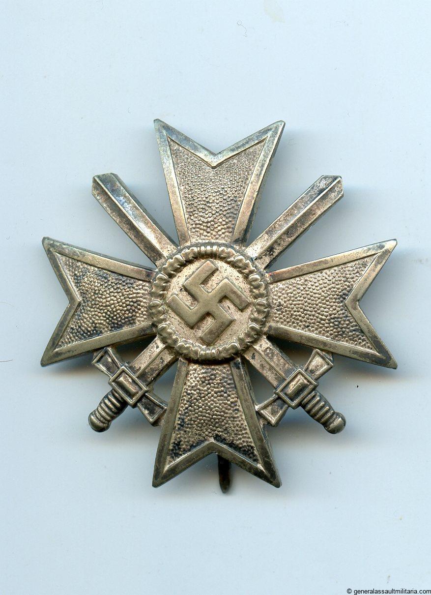 War merit cross with swords – Kerbach & Oesterhelt, Dresden. Early war tombac Kriegsverdienstkreuz with vaulted appearance in honest worn condition. Still shows some of the frosting present and remains nicely plated for a worn kvk. Shows some patina and age but overall a good worn example and nicely maker marked with PkZ code 62 under the pin.