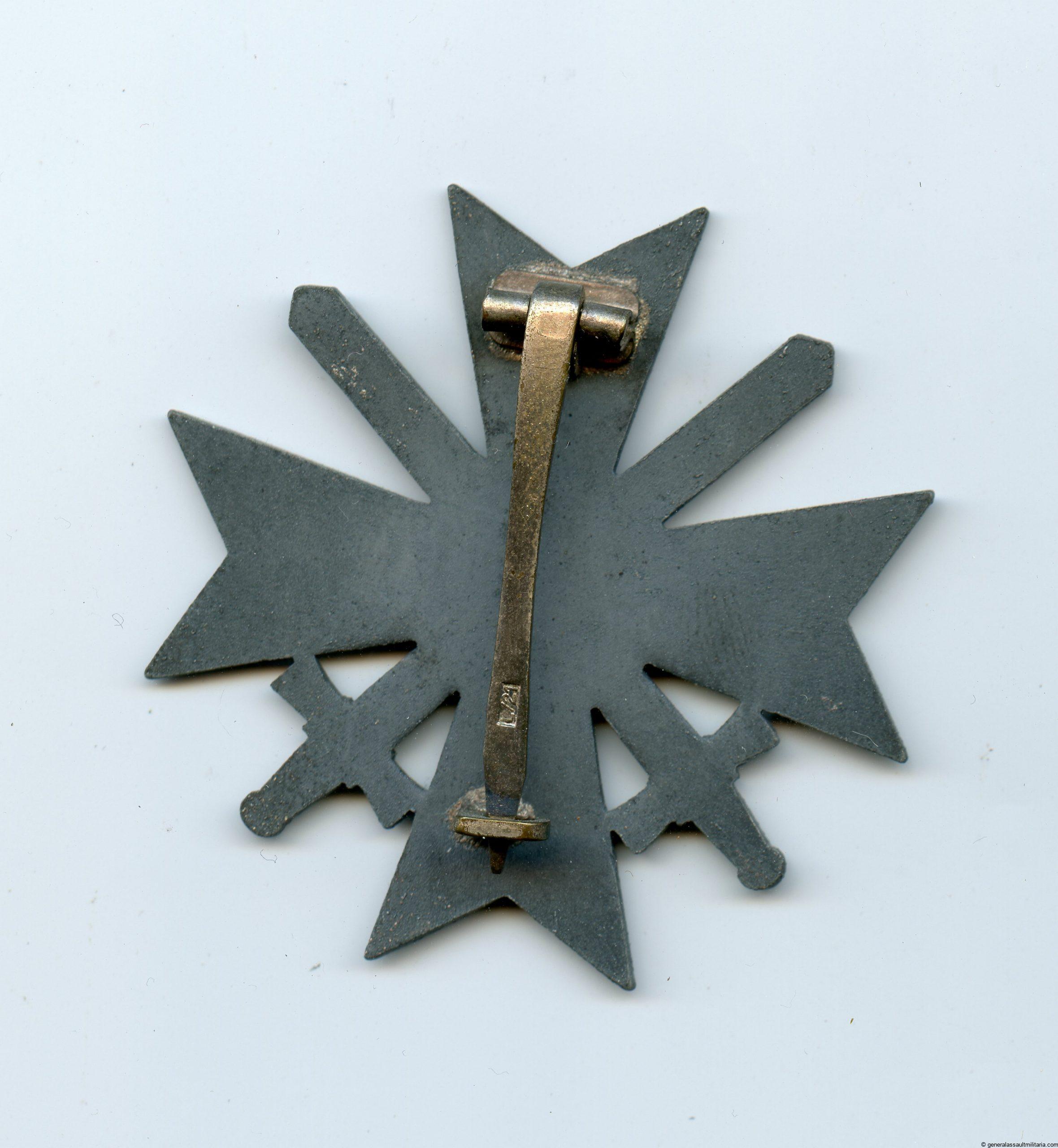 War merrit cross with swords first class – L/21 Förster & Barth, Pforzheim. Later period zink KvK with swords with typical F&B setup and L/21 mark on the pin. The bright finish has turned dark and grey zink color has taken over. One of the more uncommon zink KvK without damage or repairs.