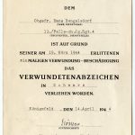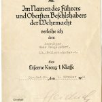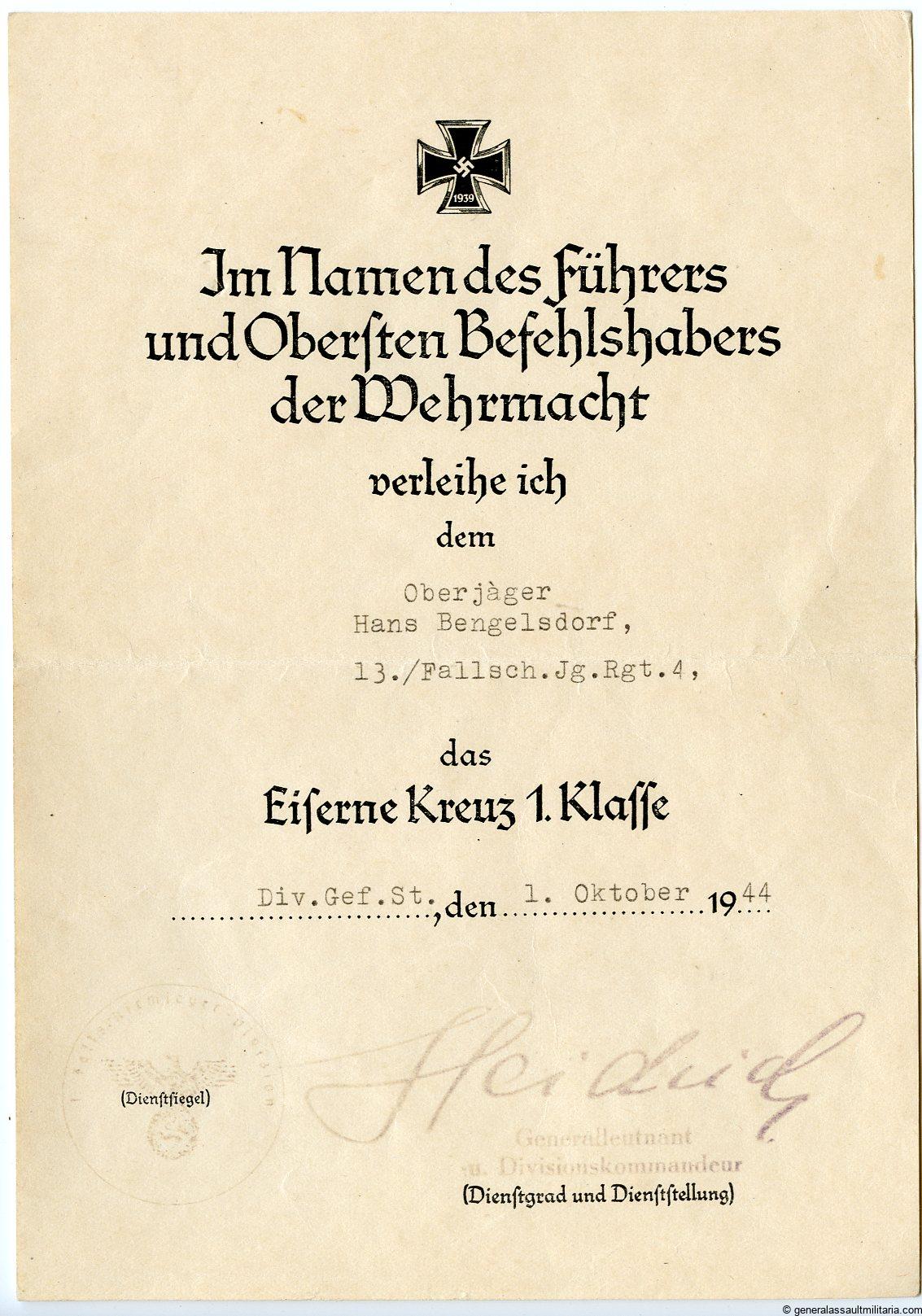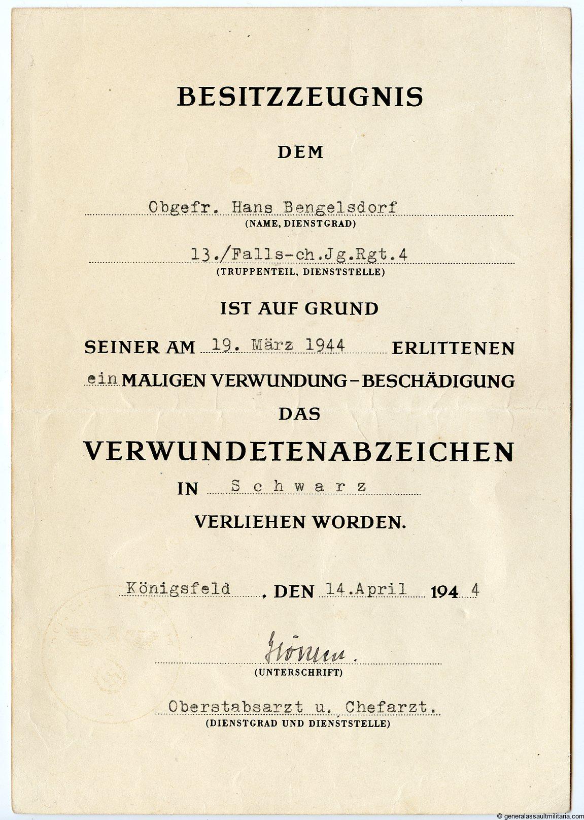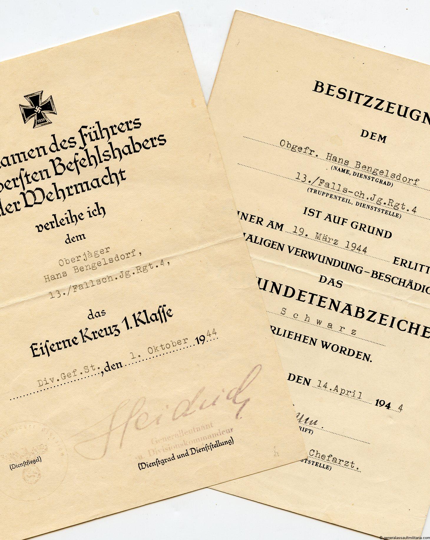 Small award document set to Fallschirmjäger Obergefreiter Hans Bengelsdorf who served with Fallschirmjäger regiment 4 which served in Italy during the last years of the war. Hans was warded the wound badge in black for being wounded during the first battle of Casino on 19.3.44. Later on Hans earned the Ek1 during defending some strategic villages with the 4th Fallschirmjäger regiment.