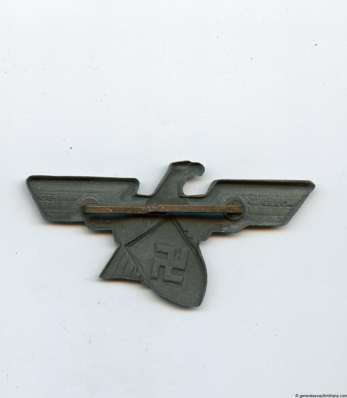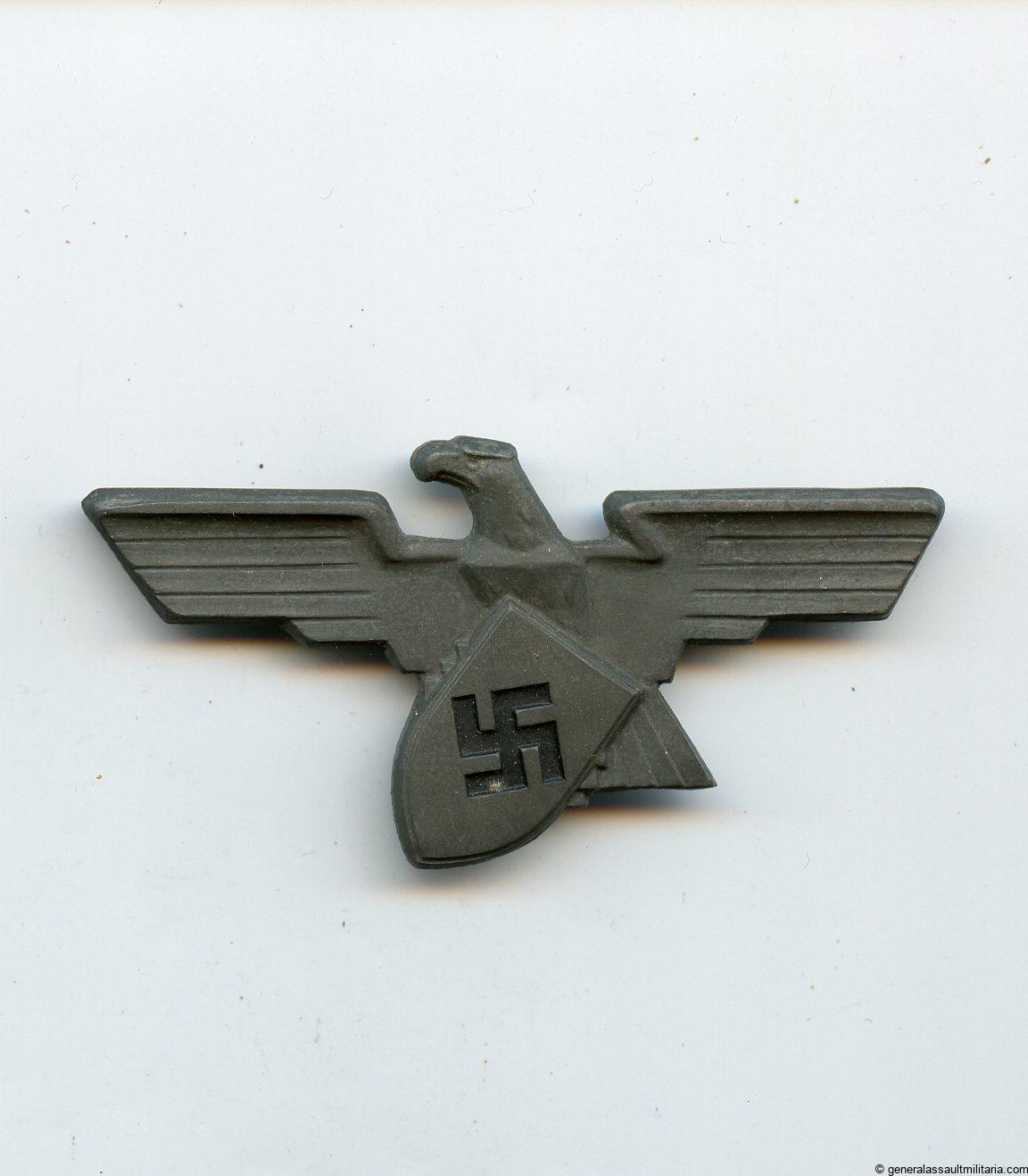 ‘Werkschutz’ – Factory protection police cap eagle. Zinc cap eagle with soldered prongs and black painted swastika. Remains in unworn condition with dark grey look to the base zinc material and still nicely painted black swastika. Esthetic and uncommon eagle design.
