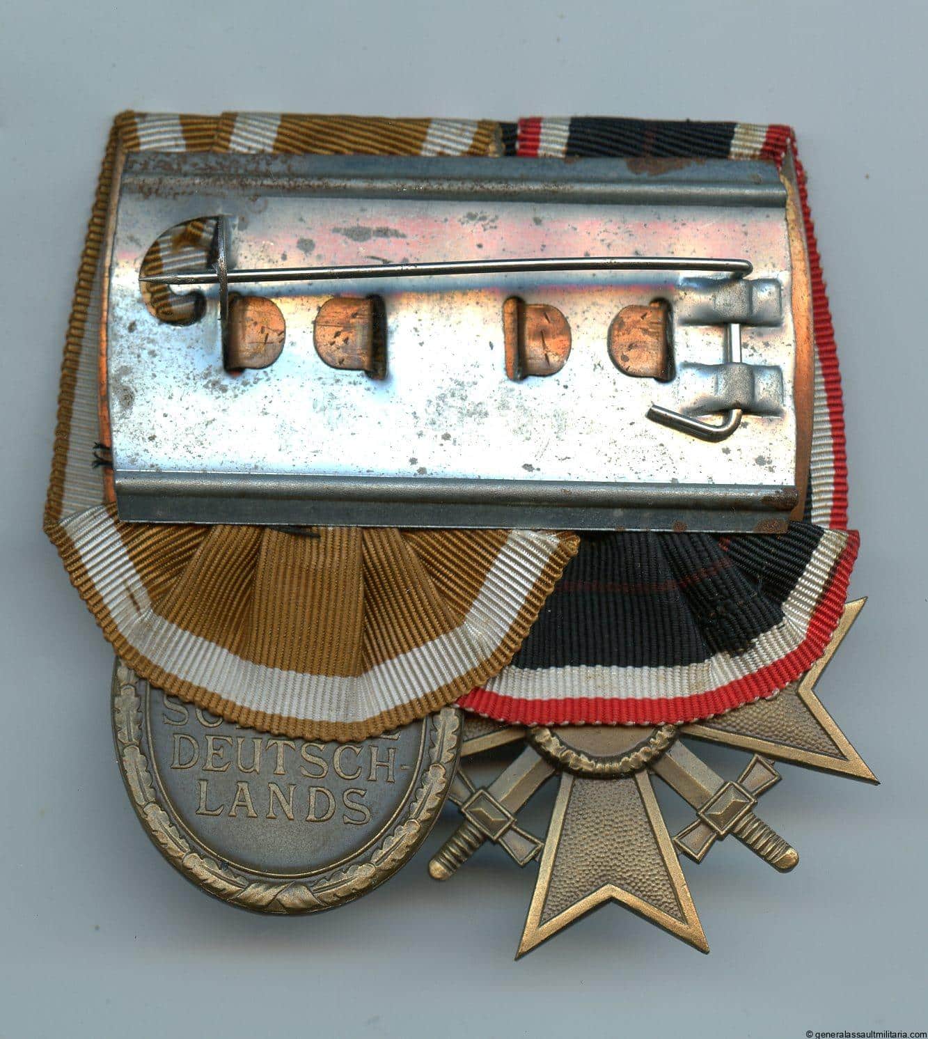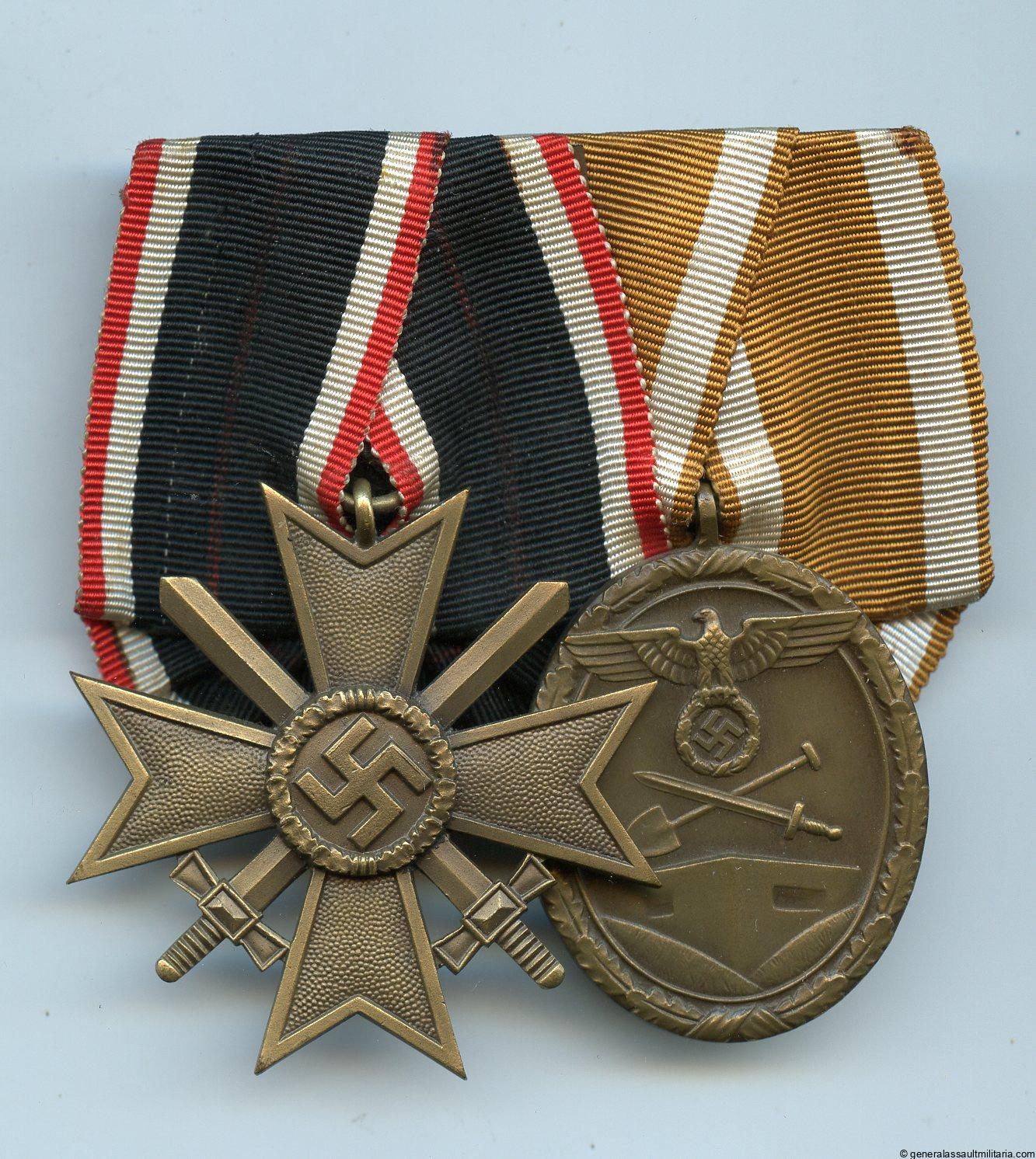 West wall + KVK2 medal bar. Unworn medal bar with tombac West wall medal and tombac war merit cross 2nd class with swords medal. Remain in unworn mint condition and the bar shows no backing.