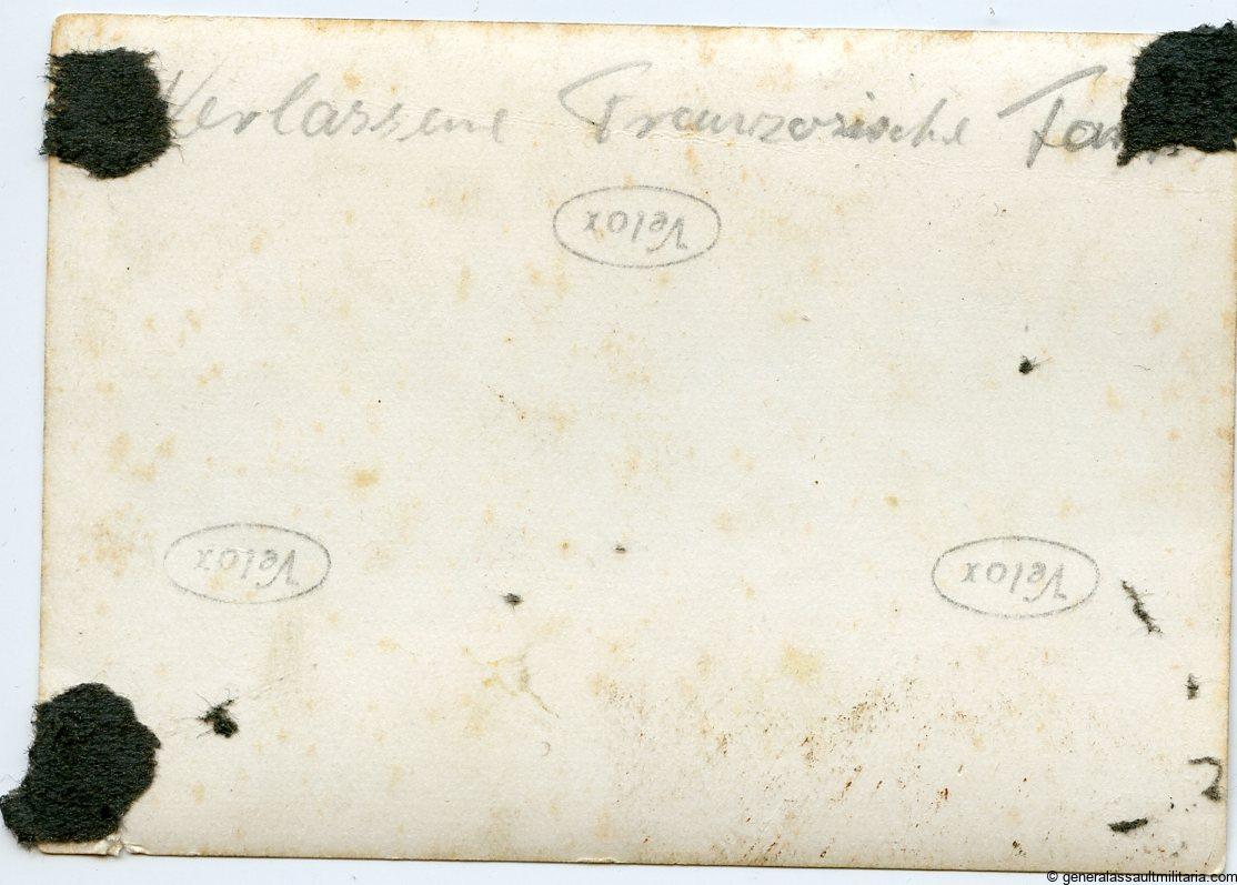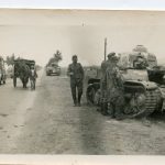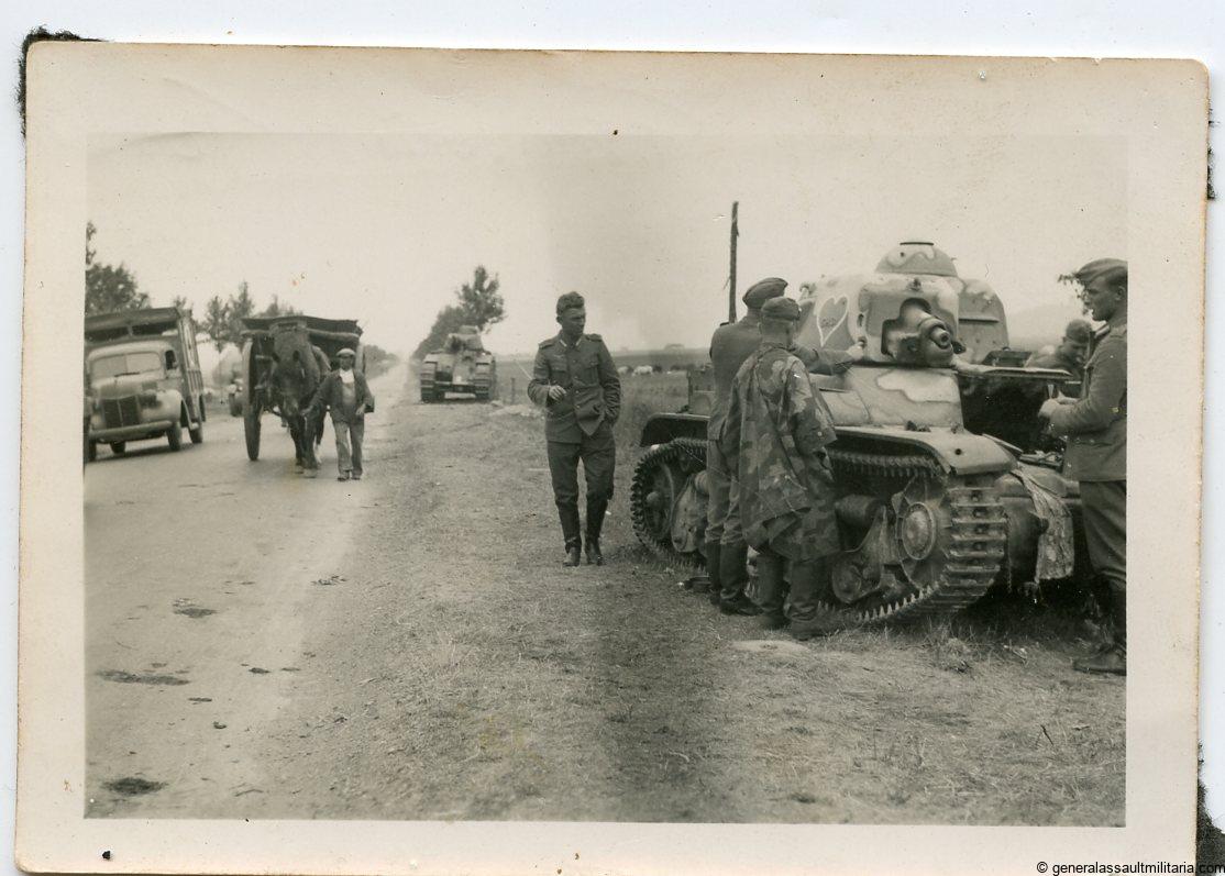 WH soldiers inspecting Renault R35 tank. Picture taken during the campaign in france, Wehrmacht soldiers inspecting abandoned/destroyed Renault R35 Tank. In the bank ground a heavier French tank is visible as well as another unknown tank behind the horse with cart. Good looking picture on period French Velox paper, album removed but in good condition. 6×9 Cm