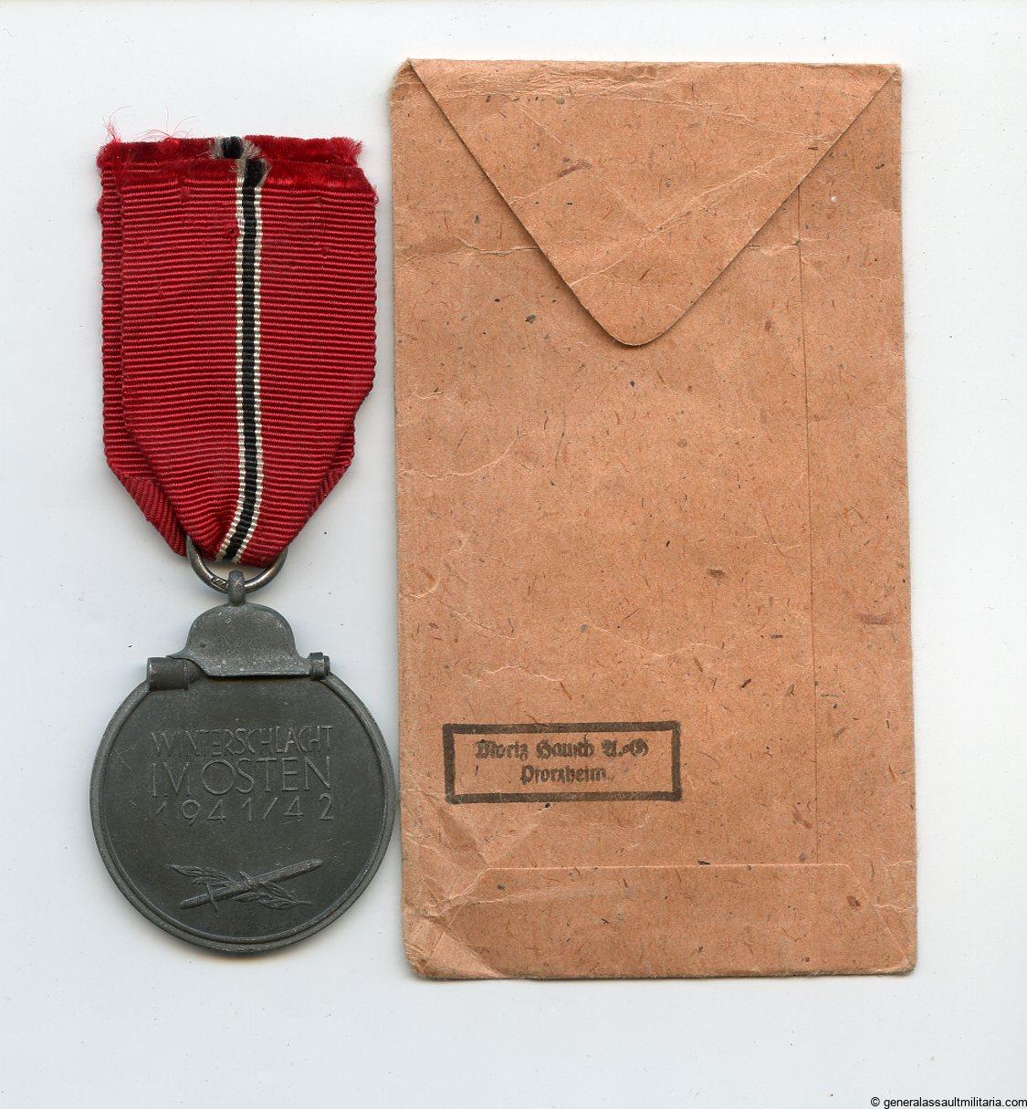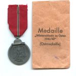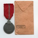 Winterschlacht im Osten medal + pouch – Moritz Hausch A.-G , Pforzheim. sharp looking Ost medal with more of a grey looking rim and helmet. Pouch remains in near perfect condition with just a blue spot to the fornt. Medal is also marked 127 for M. Hausch. Slightly more uncommon pouch to find.